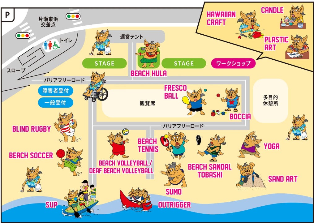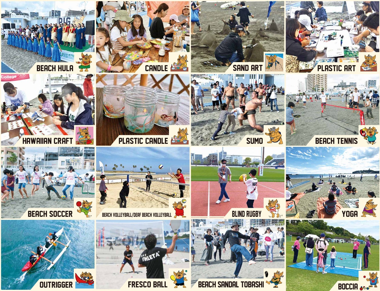 当日は、参加者全員で海や浜のゴミ拾いを行った後、ビーチスポーツやマリンアクティビティ、アートプロジェクトなど、多彩なワークショップを楽しめます。今年は17種類のプログラムを用意しており、足が不自由な方も、目や耳が不自由な方も、障害がある方、ない方も、みんなが気軽に来て、楽しめる、幅広い世代の方々をお迎えします。