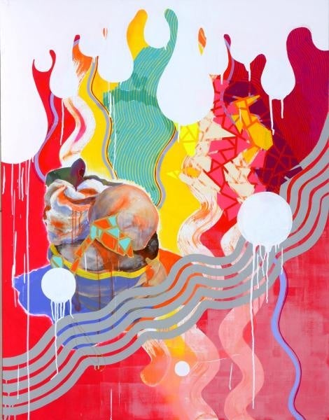 鮮烈な色彩と絵の具の垂らし込みなどの技法がさえる抽象作品。