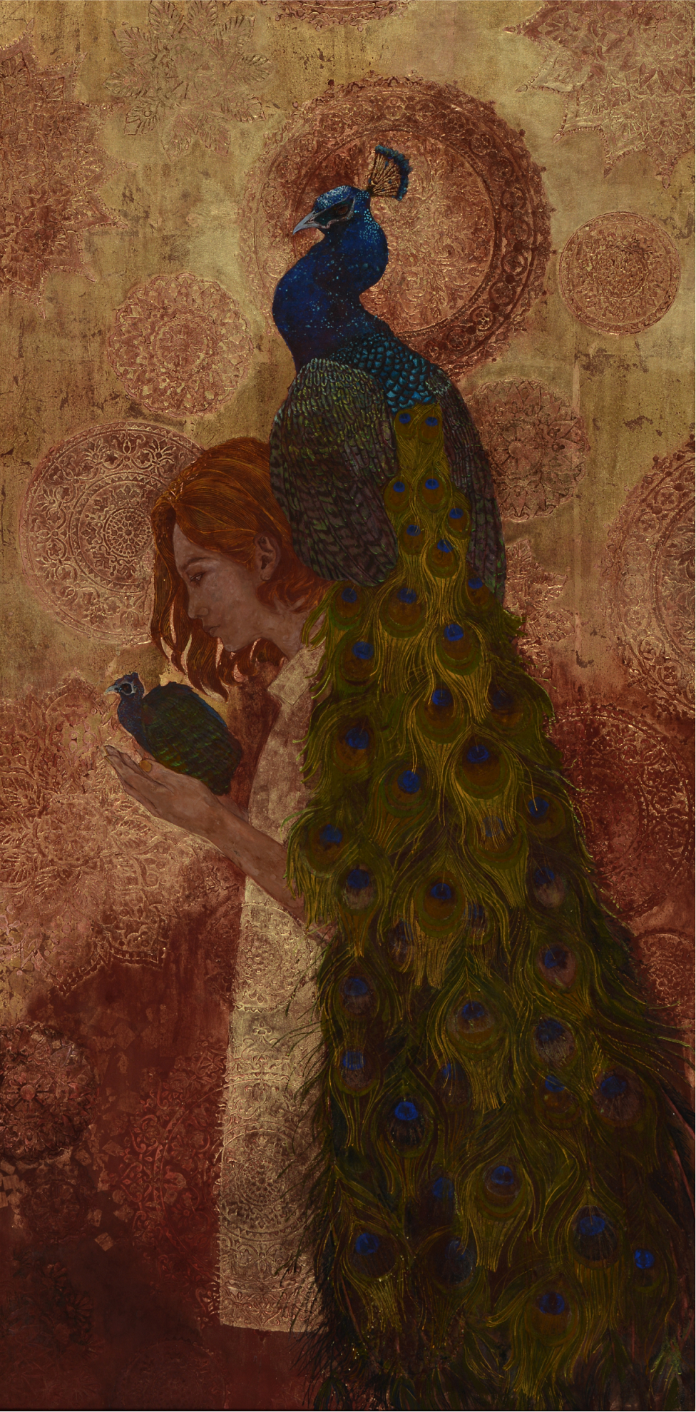 中央の孔雀は素晴らしい絵や活躍している作家を表し、人物の手に乗っている孔雀のヒナは美しい羽を持つ大人の孔雀でも このような時があったのだ。ということを表している。