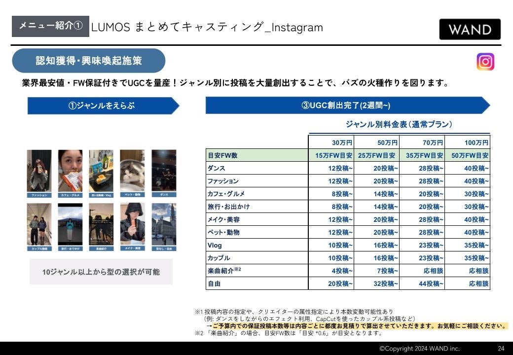 SNSを通じた楽曲のヒット創出を支援する株式会社WAND(本社:東京都渋谷区、代表取締役社長:黒﨑悠一、以下「WAND」)は、音楽業界でのInstagram需要の高まりを受け、弊社オリジナルパッケージ「まとめてキャスティング」のInstagram特化型プランの提供を開始いたしました。
