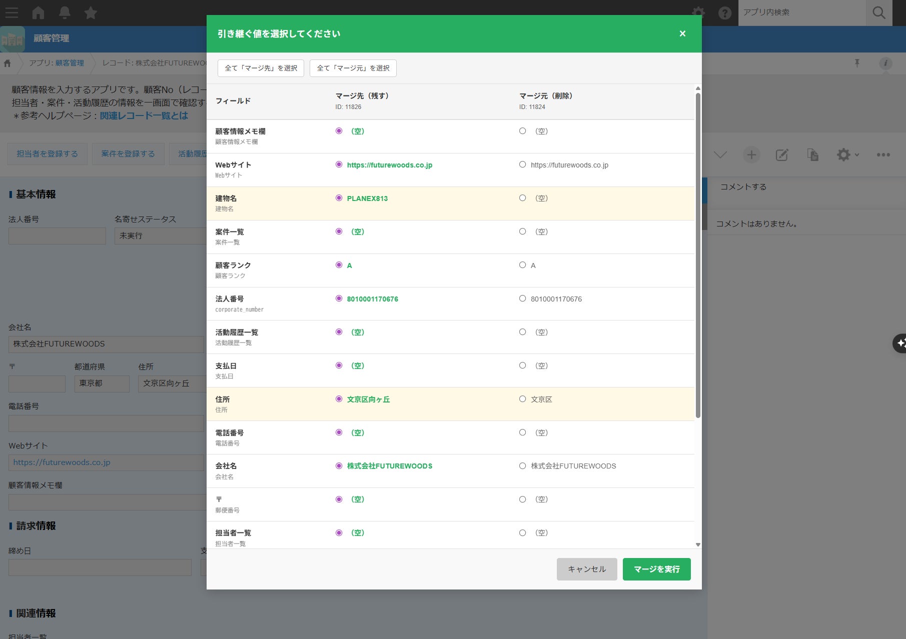同一法人と判定された重複レコードを自動検出し、フィールド単位で残す情報を選択しながら統合が可能です。