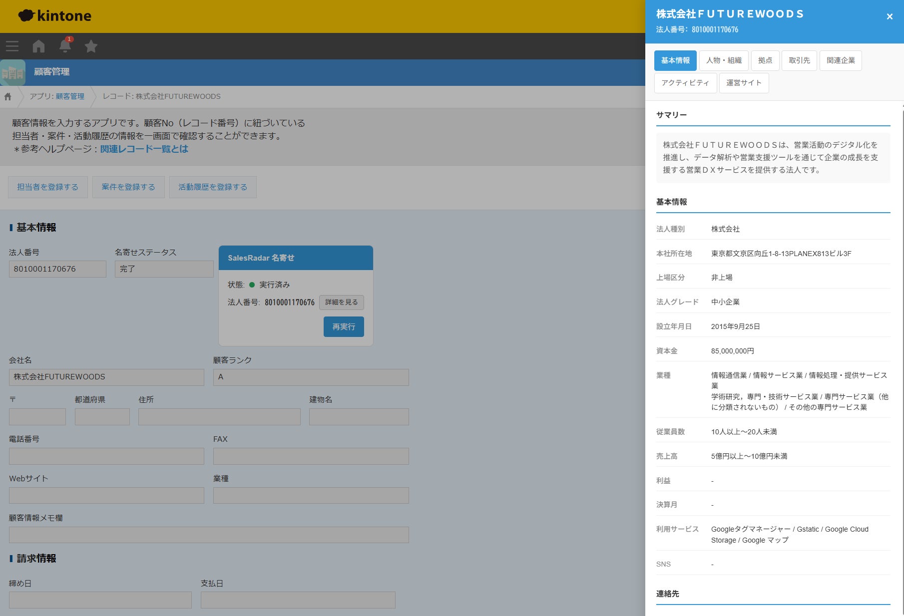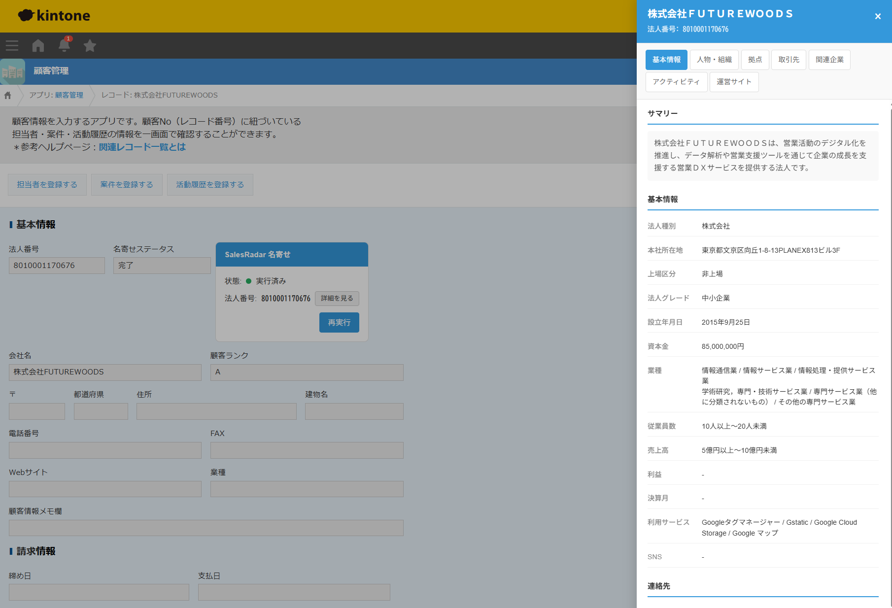株式会社FUTUREWOODS(本社:東京都文京区、代表取締役:小浜 勇人、以下「当社」)は、サイボウズ株式会社が提供するビジネスアプリ作成プラットフォーム「kintone」向けに、当社が運営する法人データベースサービス「SalesRadar」と連携した名寄せプラグインの提供を開始いたしましたのでお知らせいたします。