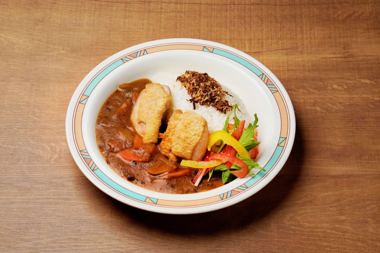 「タマネギぐるりこ」をカレーのベースに使用し、さらに仕上げにもトッピング。塩麴で漬け込んだ柔らかい鶏もも肉とともに、香ばしい風味が広がる一品です。
