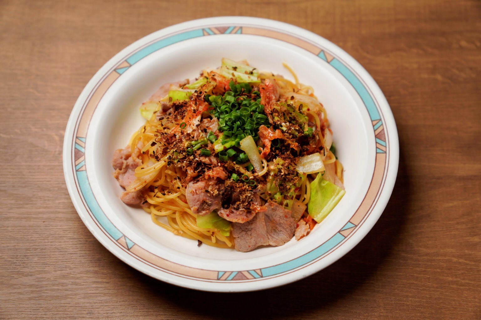 豚肉とキムチを炒めたピリ辛のパスタに、「タマネギぐるりこ」をトッピング。スパイシーな味わいの中に、タマネギの旨味が広がります。
