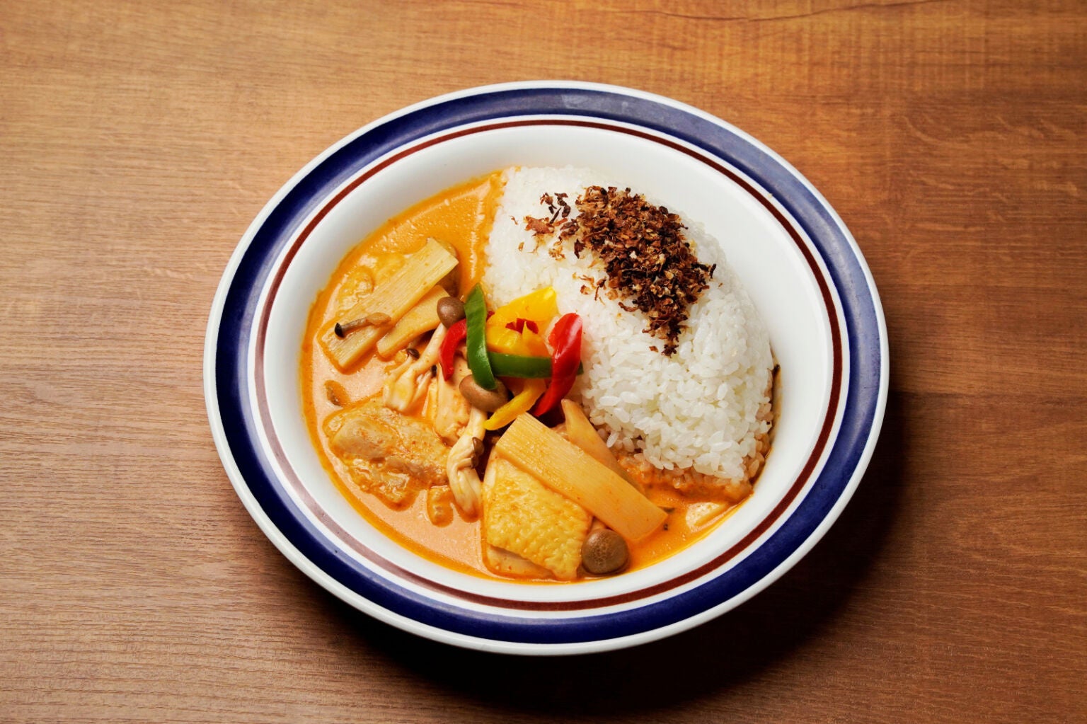 ココナッツミルクとレッドカレーペーストを合わせた本格派レッドカレー。タマネギの旨味を凝縮した「タマネギぐるりこ」のトッピングとともに、たっぷりの野菜とお肉を楽しめます。