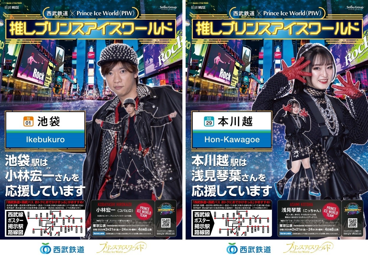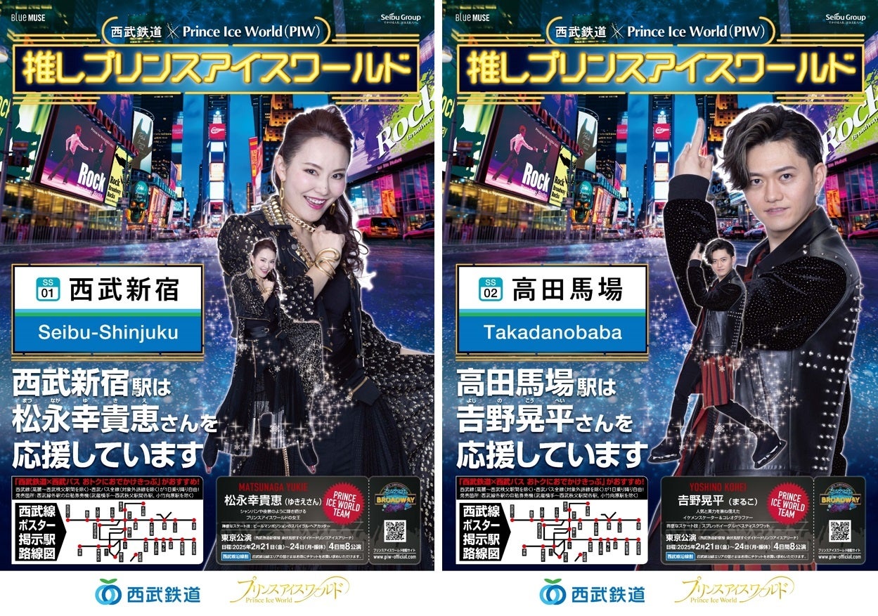 西武鉄道株式会社(本社:埼玉県所沢市、社長:小川 周一郎)と株式会社ブルーミューズ(本社:東京都豊島区、代表取締役:安孫子 学)は、ダイドードリンコアイスアリーナ(最寄り:西武鉄道新宿線 東伏見駅)で2025年2月21日(金)~24日(月・休)に開催する「プリンスアイスワールド2024-2025 A NEW PROGRESS BROADWAY ROCKS!東京公演」にあわせ、2024年12月10日(火)より「駅の推しプリンスアイスワールド(PIW)」を実施します。この企画は、西武線の26駅がそれぞれ“推し”のPIWチームメンバーを設定し応援することで、普段利用する駅を通じてプリンスアイスワールドだけでなく、プロスケーターであるチームメンバーに親しみを持っていただくため、前回の東京公演(2024年1月)に引き続き実施するものです。また、初めての取り組みとして西武鉄道の10駅において「駅の推しPIWガチャ」を設置し、PIWチームメンバーがモデルのアクリルボールチェーンがお買い求めいただけるようになります。