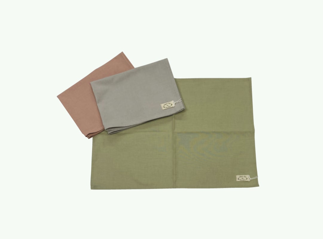 ランチョンマット。「もったいない」という環境配慮への熱い想いから独自に開発した染色方法です。