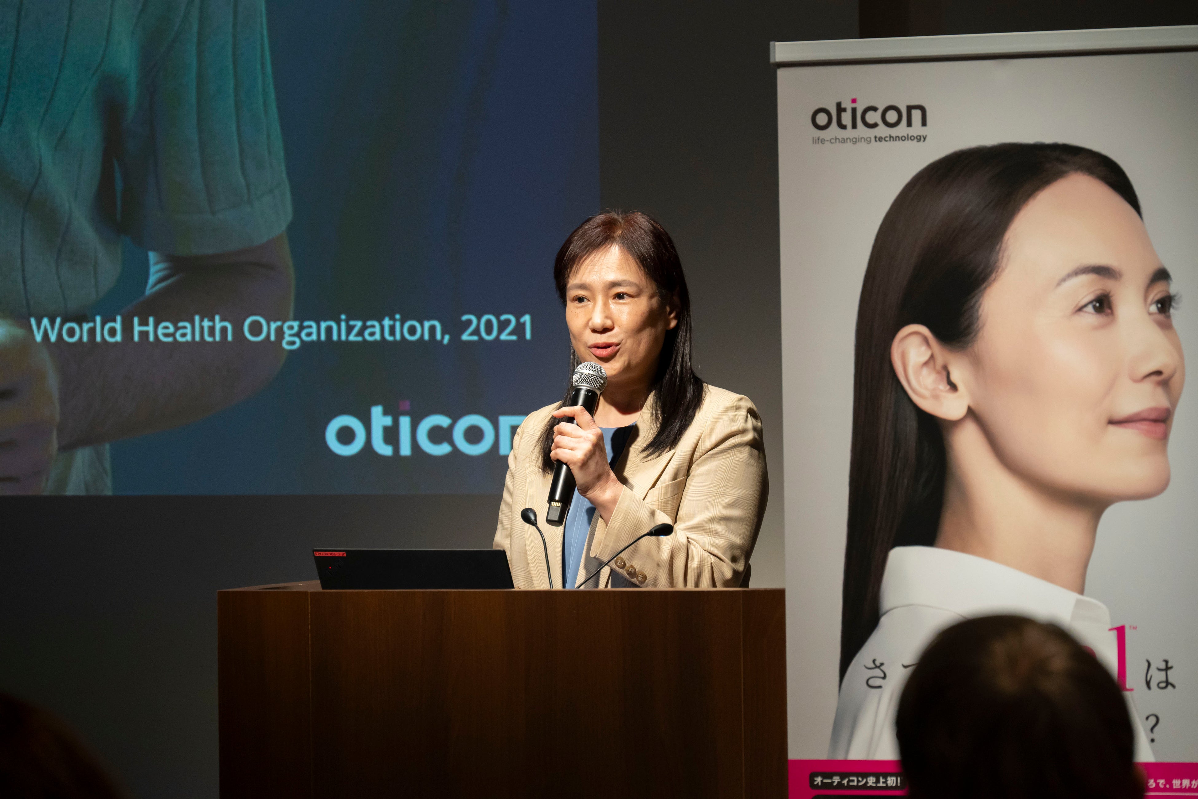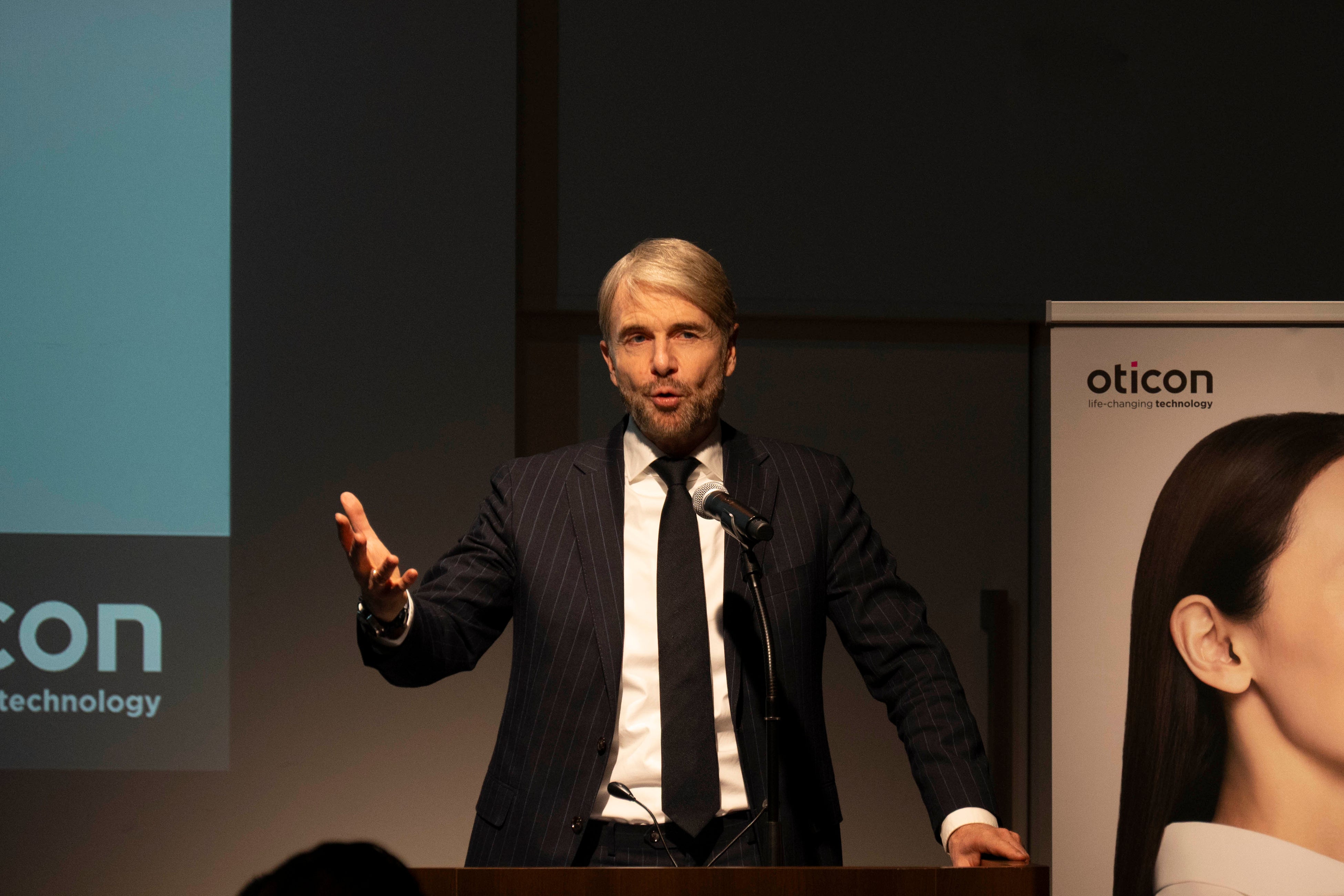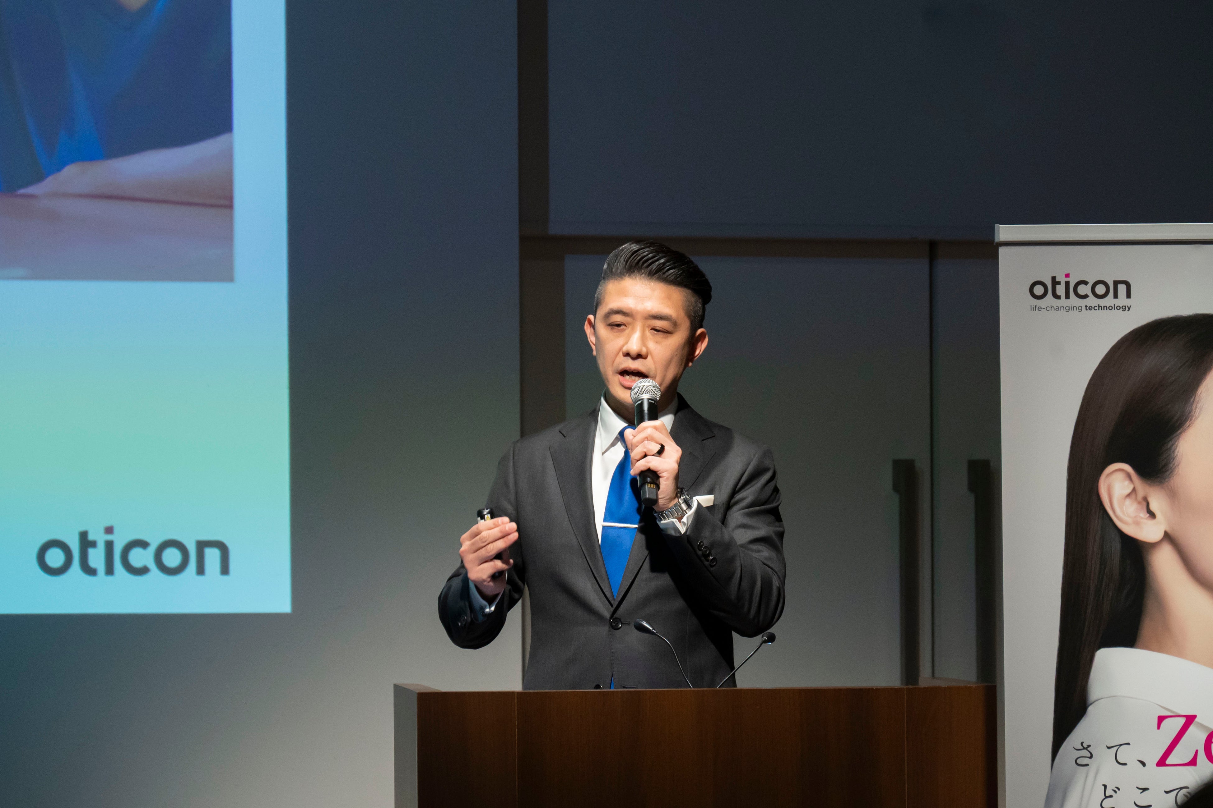 続いて、当社代表取締役社長の齋藤徹が登壇し、日本における難聴の現状や補聴器装用率(15.6%)の低さを示すとともに、補聴器装用が推奨される方であっても、スティグマにより装用をためらうケースが多い現状について言及しました。「ジール」は、こうした課題を克服するために開発された製品であり、製品名に込められた“強い熱意と使命感”には「聞こえの未来を変えていく」という「オーティコン」の決意が表れていると説明しました。 最後に「ジール」への期待と、補聴器市場拡大のゲームチェンジャーとなる製品であることを確信していると述べました。