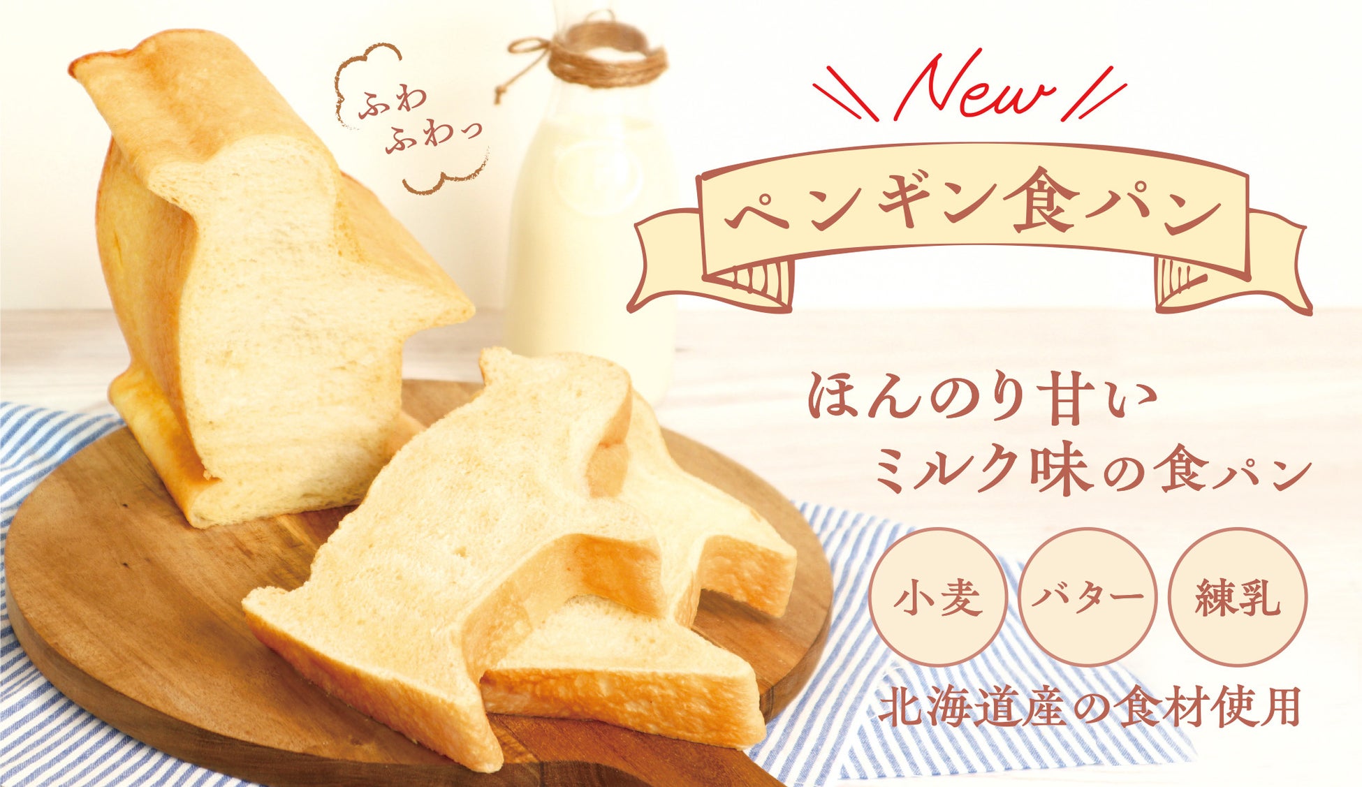 「ペンギン食パン」は、北海道産の小麦・バター・練乳をつかい、ほんのり甘いミルク味の食パンに仕上げました。