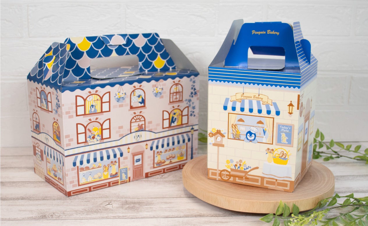かわいいパン屋さんをモチーフにした箱に、ペンギン食パンが1個入ります。