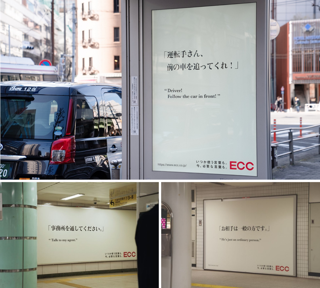 ECCブランドと英会話学習そのものに好意や興味を持ってもらう目的で実施した広告キャンペーン。「映画やドラマなどで一度は聞いたことがあるけど、一度も使う機会がなさそうな」ドラマティックなフレーズたちを選び、ECCチームと共同で翻訳、全国の屋外広告やSNS広告で展開しました。