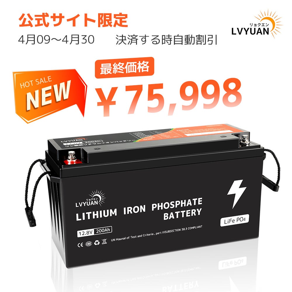 12.8V200Ahのリン酸鉄リチウムイオンバッテリー:https://lvyuan.jp/collections/lithium-ion-battery/products/12v200ah-lifepo4-battery