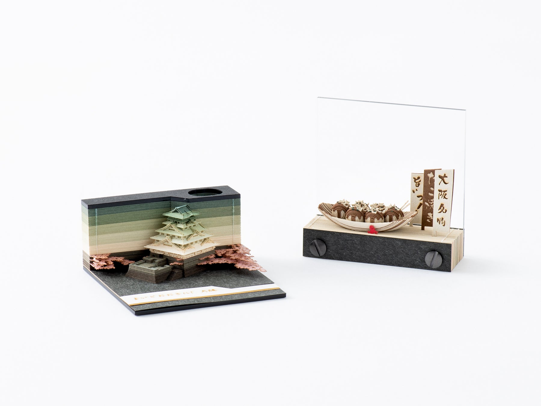 ブロックメモを一枚一枚めくっていくと、城やたこ焼きなどの立体的で緻密な造形が出来上がっていく【OMOSHIROI BLOCK】