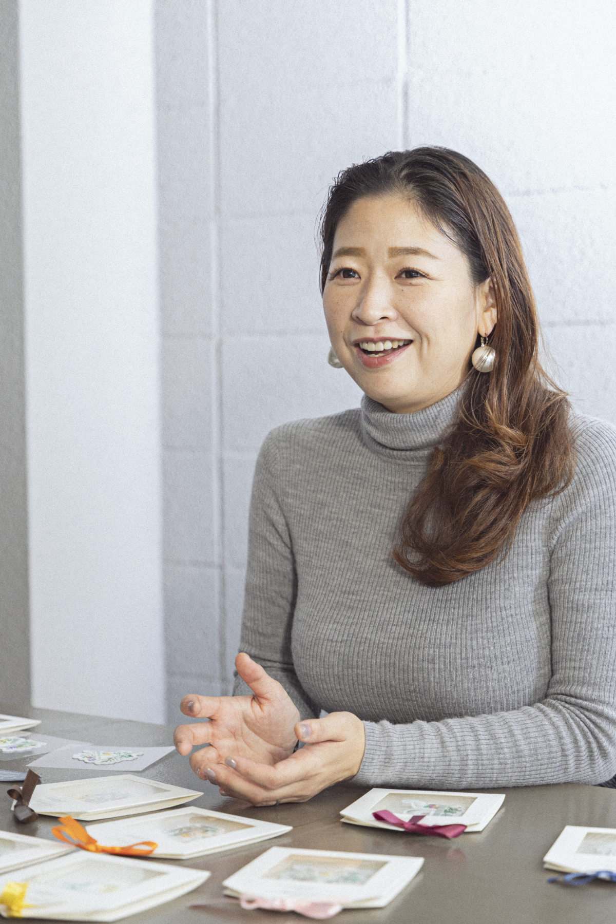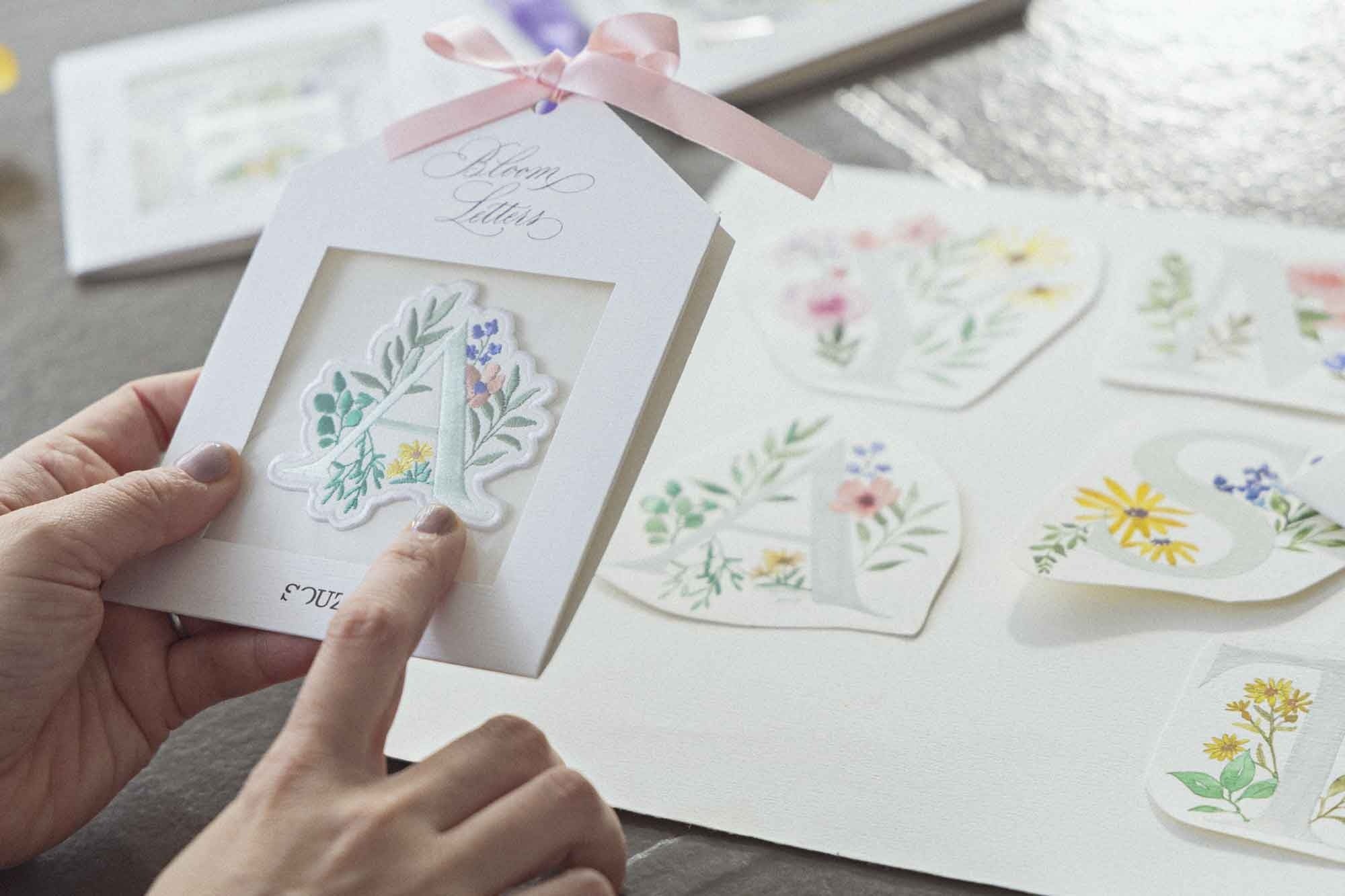 島野氏が手書きしたイニシャルと草花を組み合わせたデザインへ、実際の刺繍を施した立体的な仕上がりが特徴。指先で感じる刺繍の手触りと、アナログならではの不完全さが、唯一無二の個性を生み出します。
