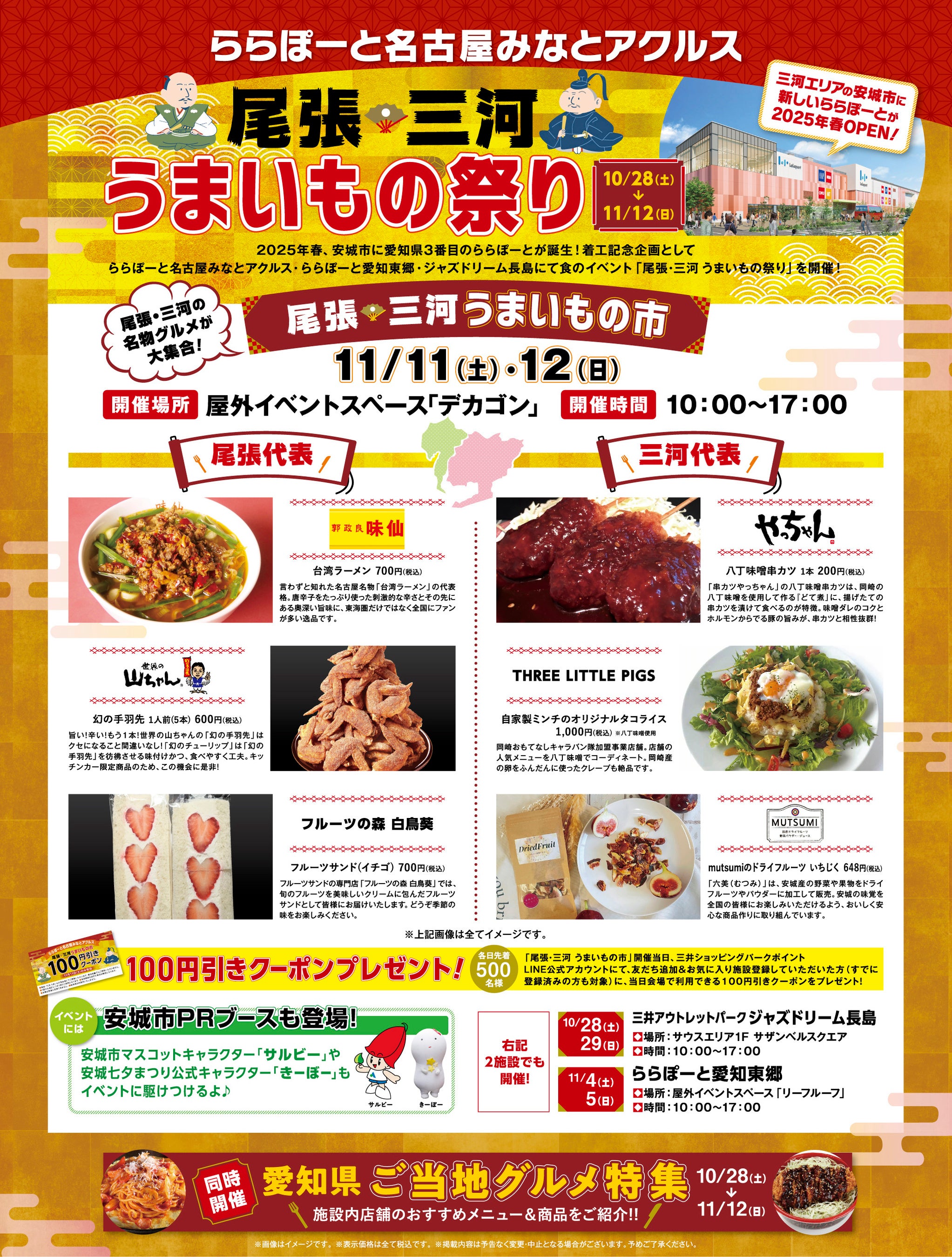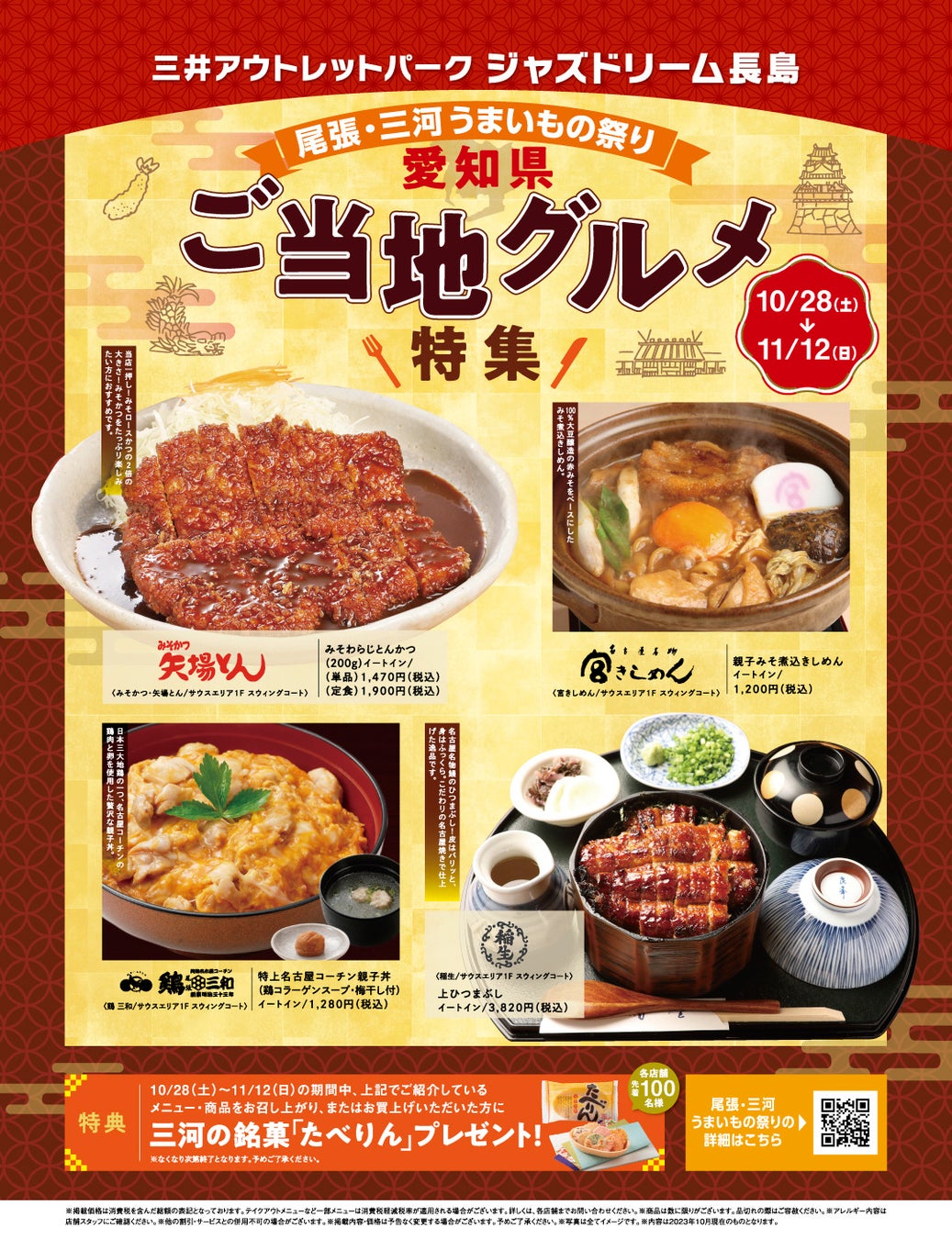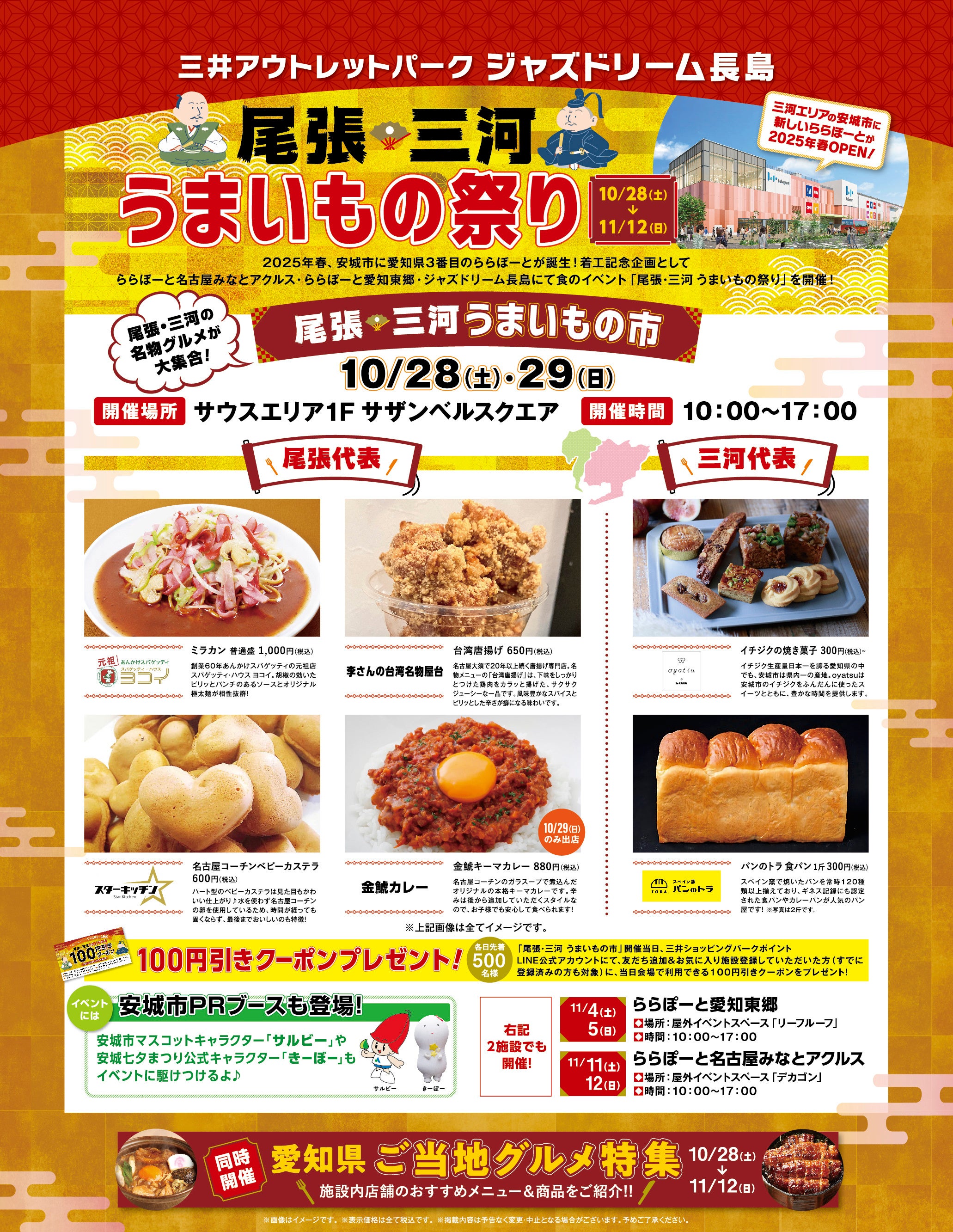 尾張・三河エリアを代表する人気店が集結!美味しいご当地グルメが各施設にて期間限定で出店いたします。出店する店舗は施設・開催日ごとに異なり、期間中はさまざまな愛知県の「うまいもの」をお楽しみいただけます。