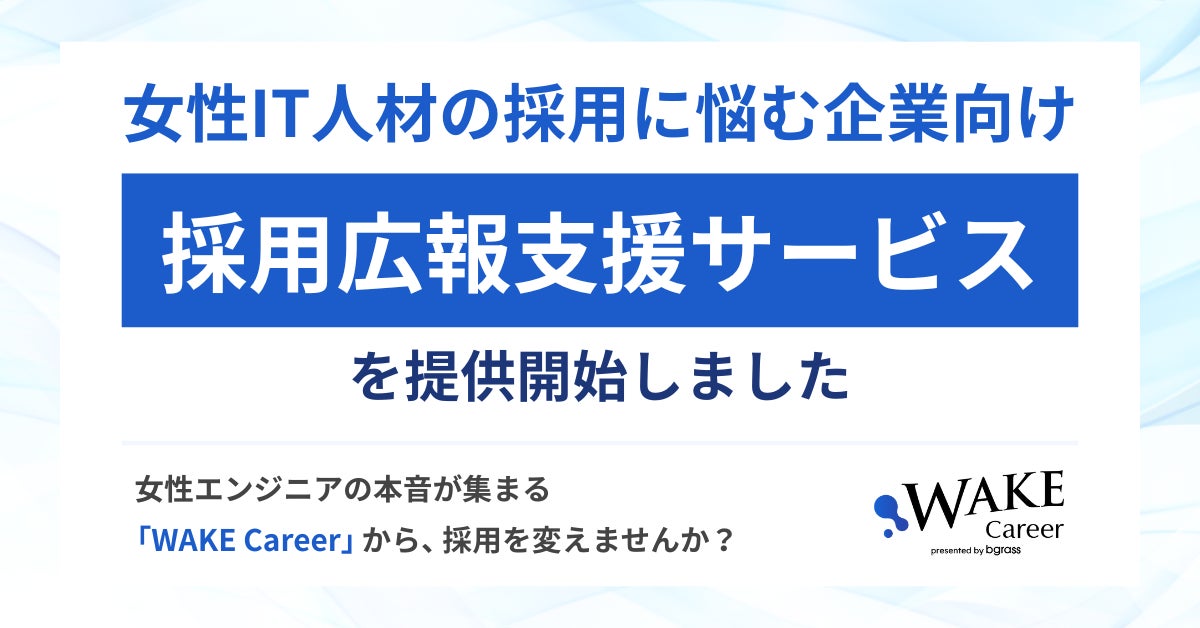 bgrass株式会社(本社:東京都、代表取締役:咸多栄)が運営する、女性IT人材向けキャリア支援サービス「WAKE Career(*1)」では、新サービスとして、女性IT人材の採用に課題を有する企業に向け、当社ならではのコンテンツ制作を通じて採用を支援する「採用広報支援サービス」の提供を開始します。