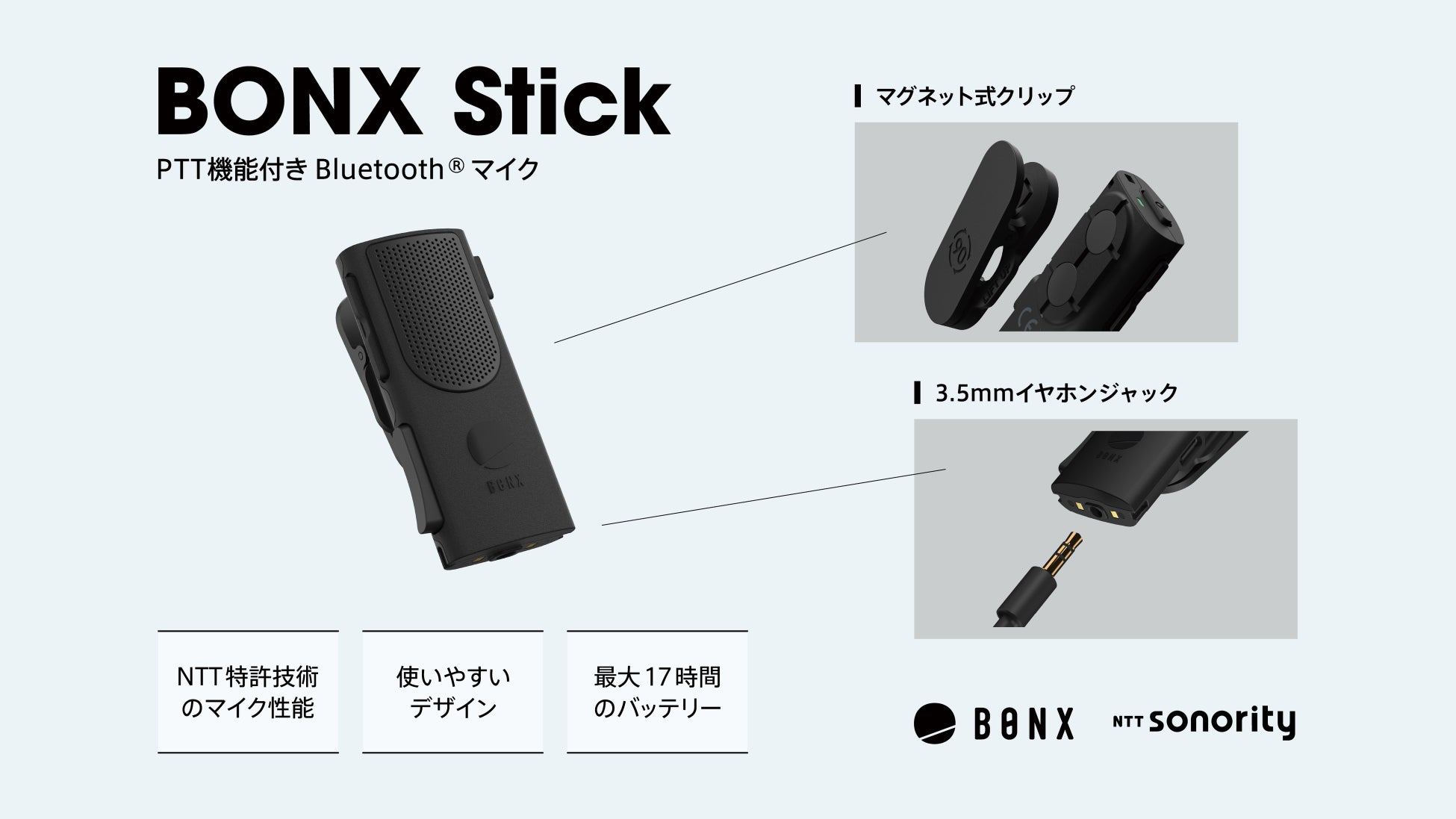 NTTの音を操るコア技術を活用した音響製品・ソリューションを展開するNTTソノリティ株式会社(本社:東京都新宿区、代表取締役社長:坂井 博、以下「NTTソノリティ」)と現場コミュニケーションのワンストップソリューション「BONX WORK(ボンクス・ワーク)」を提供する株式会社BONX(本社:東京都中央区、代表取締役:宮坂貴大、以下「BONX」)は、2025年2月12日(水)新発売のコミュニケーションデバイス「BONX Stick(ボンクススティック)」とLINE WORKS株式会社が手掛けるトランシーバーアプリ「LINE WORKSラジャー」がデバイス連携に向けた実装を開始したことをお知らせいたします。
