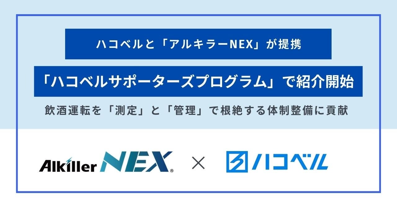 【提携お知らせ】クラウド型アルコールチェッカー『アルキラーNEX』がハコベルサポーターズプログラム」との提携決定!コストパフォーマンスに優れた検知器導入で飲酒運転を根絶