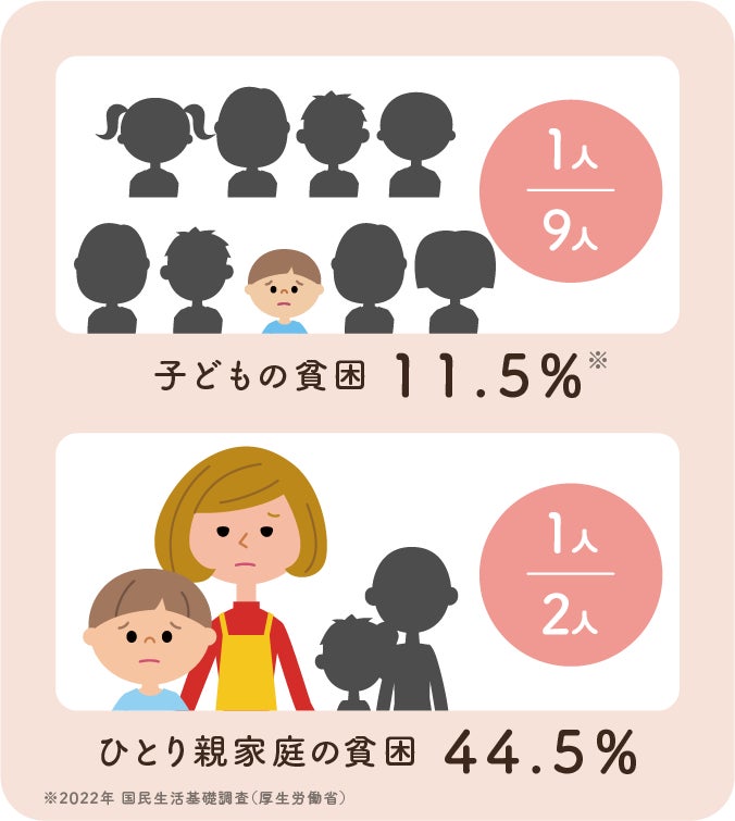 日本の子どもの相対的貧困率は11.5%(2022年 厚生労働省「国民生活基礎調査」)。18歳未満の子どもの約9人に1人が貧困状態にあり、とりわけひとり親家庭では44.5%と、およそ2人に1人が厳しい状況に置かれています。経済的な困窮だけでなく、孤立や心のしんどさが重なり、「たすけて」と声をあげられないまま支援から取り残される家庭も少なくありません。