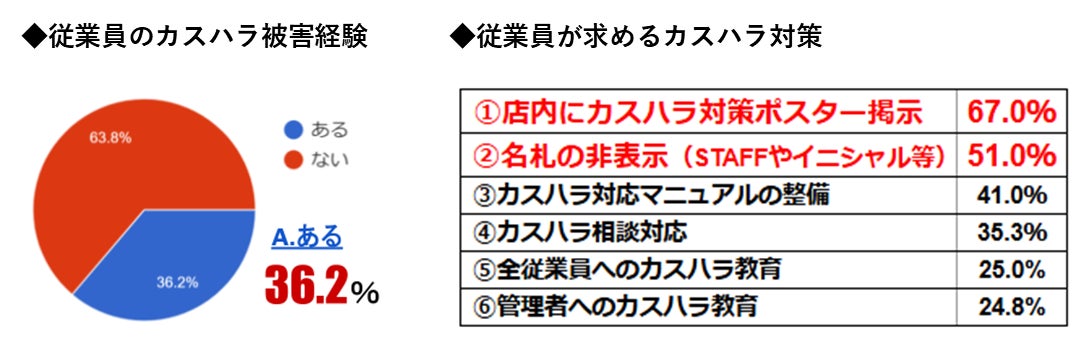 当社で昨年実施した従業員へのカスハラの実態調査では、全体の36%の従業員がこれまでに理不尽な暴言や叱責、大声で怒鳴られる等のカスハラを受けたことがあると回答。さらに、「名札(名前表示)があることで嫌な思いをしたことがあるか?」の設問には、全体の23.6%が「ある」と回答し、特に、チェッカー(レジ)部門では、責任者の52%が「ある」と回答しました。また、従業員が会社に求めるカスハラ対策として、半数以上の方が「店内にカスハラ対策ポスターの掲示」と「名札の名前非表示」を望んでいる回答となりました。