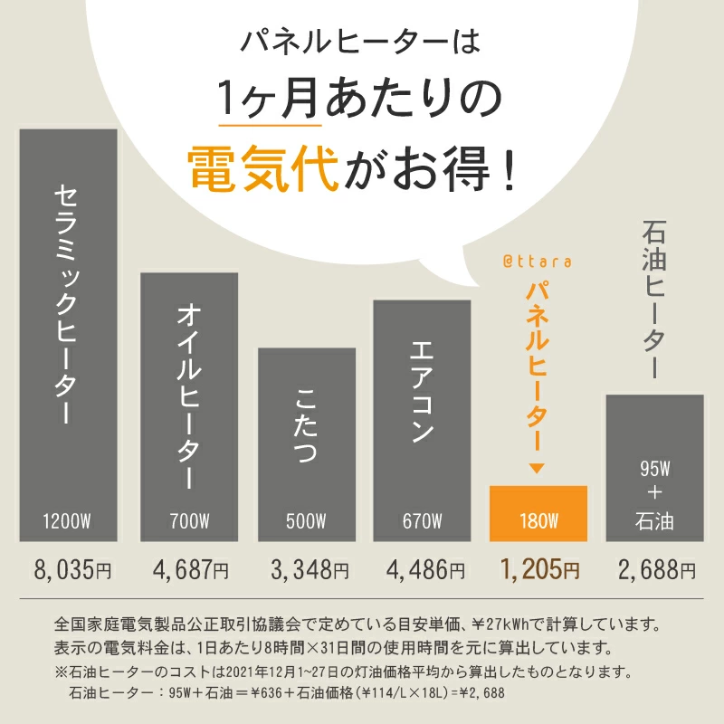 パネルヒーターは他の暖房器具に比べて、電気代も高くなりがち。強・弱などパワーの切り替えがついているものや、部屋の温度を感知して、暖まった時点で自動的にオフにしてくれるものなどであれば、電気代の節約に一役買ってくれます。