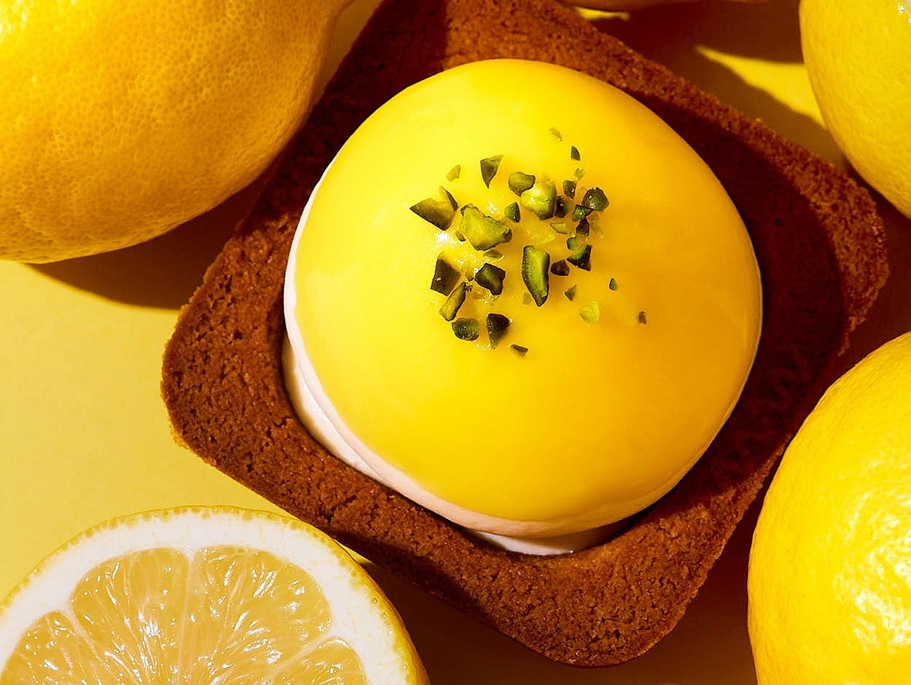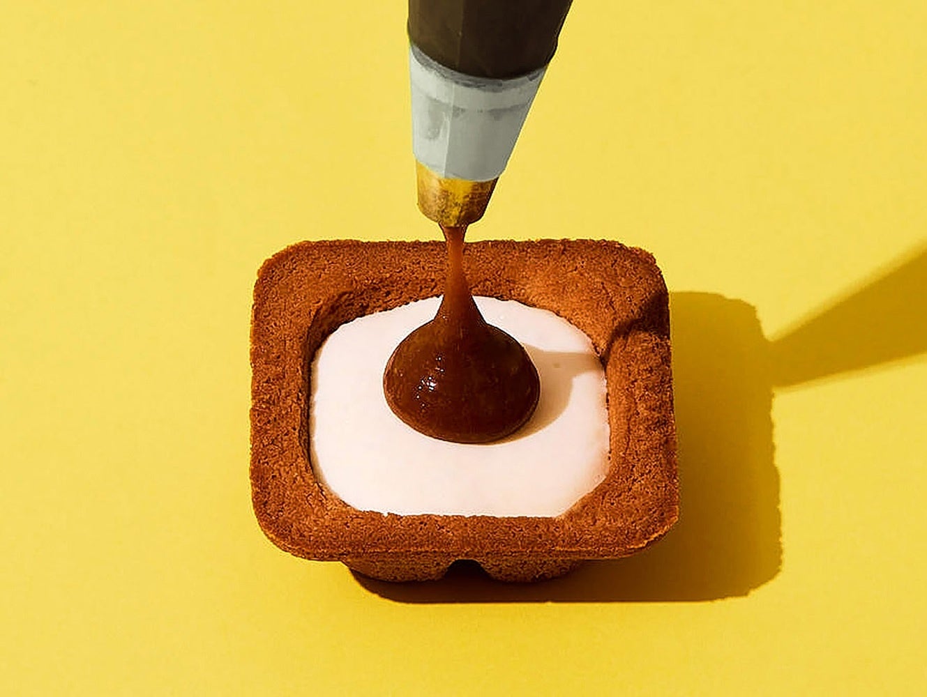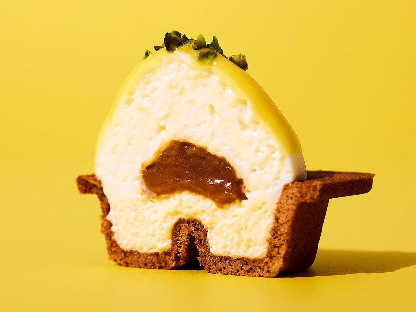美味しさの決め手は、レモンの酸味、塩キャラメルソースの甘みと塩味、チーズの旨みのバランス。挟み焼きによるザクザクのクッキー生地に、濃厚でしっとりとした生チーズスフレをのせ、フワッとした食感でチーズの風味が香るレモン生チーズムースを絞りました。