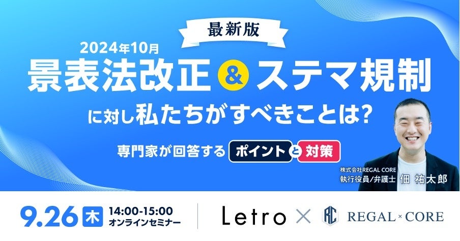 薬機法などの表現、コンプライアンスチェック事業を手がける株式会社REGAL CORE(東京都渋谷区、代表取締役社長:田之上 隼人) 執行役員/弁護士の佃が、2024年9月26日(木)14:00~15:00 オンラインにて開催される無料セミナーに登壇します。
