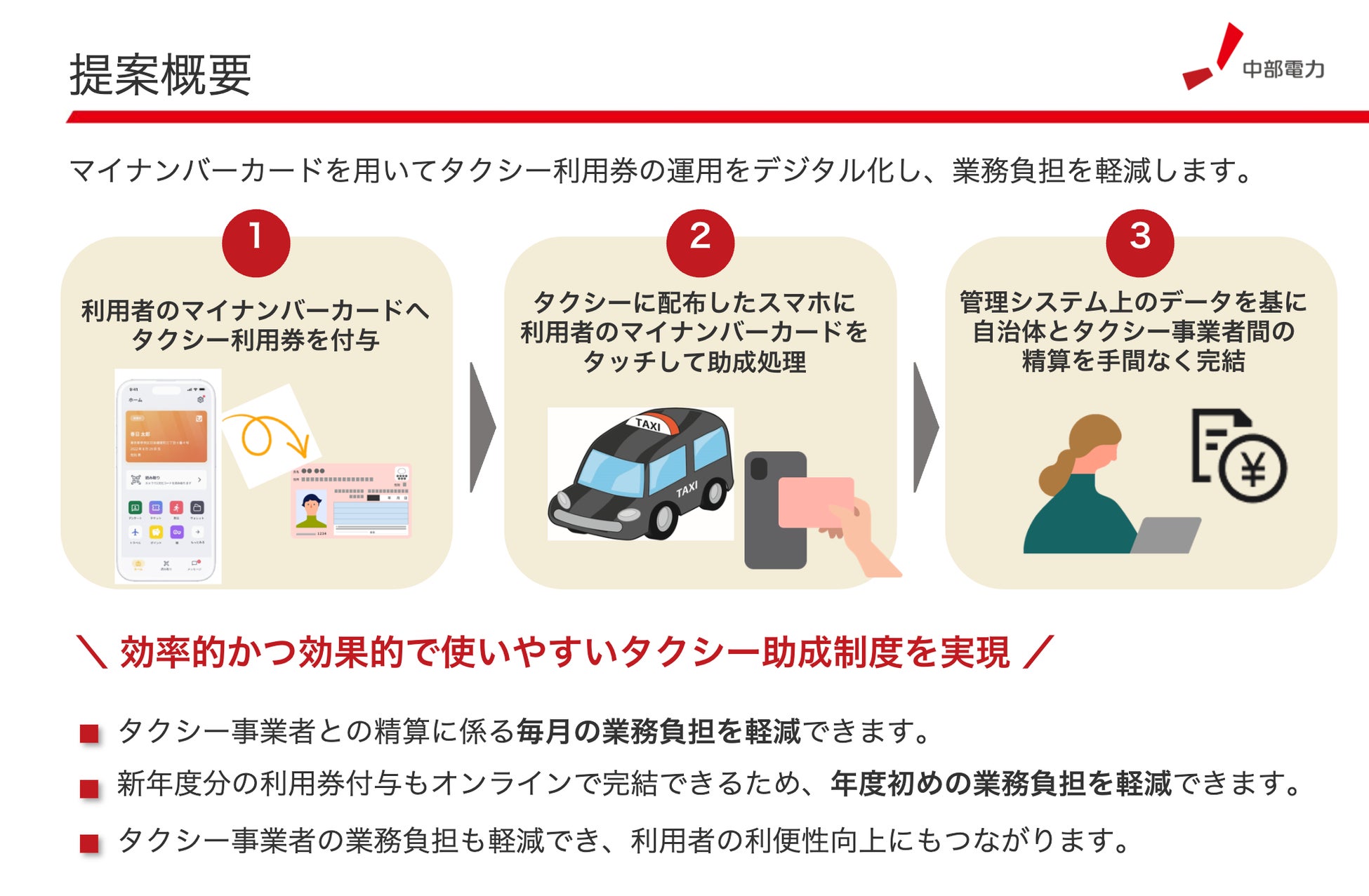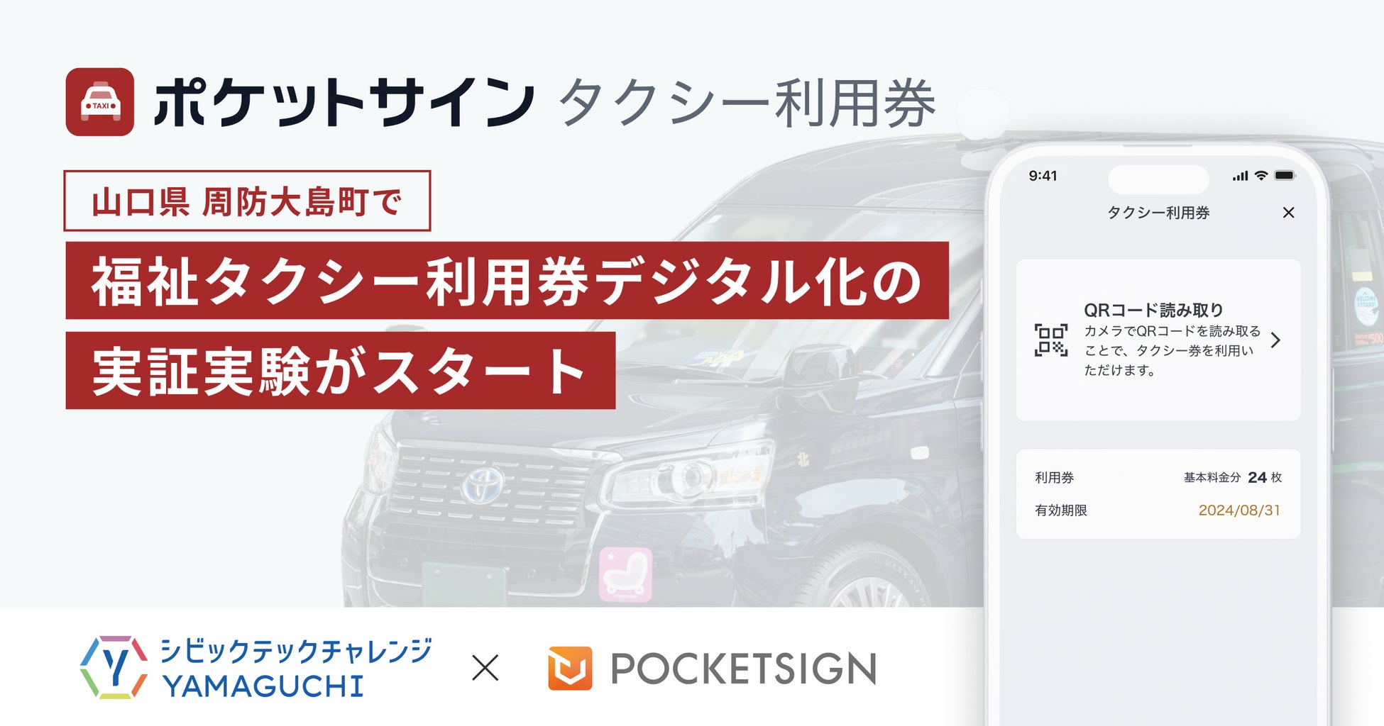 ポケットサイン株式会社(本社:東京都中央区、代表取締役CEO/COO:梅本滉嗣、以下当社)は、地域課題を解決するデジタル技術を公募する「シビックテックチャレンジ YAMAGUCHI 2024」(一般社団法人山口県デジタル技術振興財団=山口県の外郭団体=主催)において、福祉タクシーの利用券を従来の紙ベースからデジタル化する山口県周防大島町の課題に関し、当社と中部電力株式会社(本社:名古屋市東区、代表取締役社長:林欣吾)および中電クラビス株式会社(本社:名古屋市中区、代表取締役社長 社長執行役員:鈴木英也)による提案が採択されたことをお知らせします。