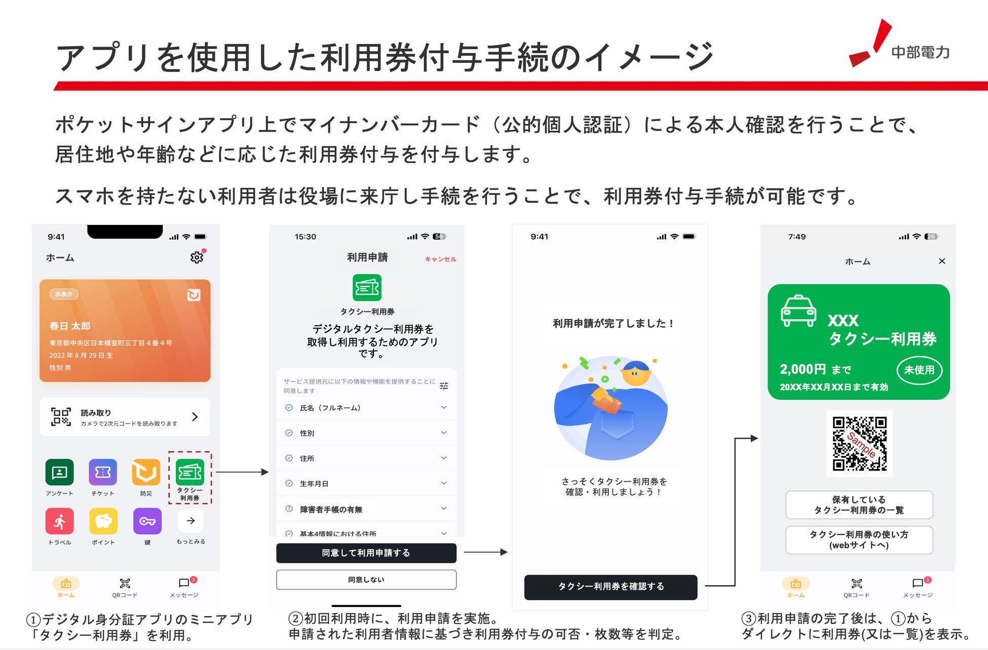 今後、当社と中部電力、中電クラビスは、マイナンバーカードの公的個人認証(JPKI)*機能を活用した当社のデジタル身分証アプリ「ポケットサイン」を用いて、スマートフォンで本人確認とタクシー利用券の付与を行い、町とタクシー事業者との間のデータ連携や精算までデジタル化する実証実験を町とともに実施する予定です。