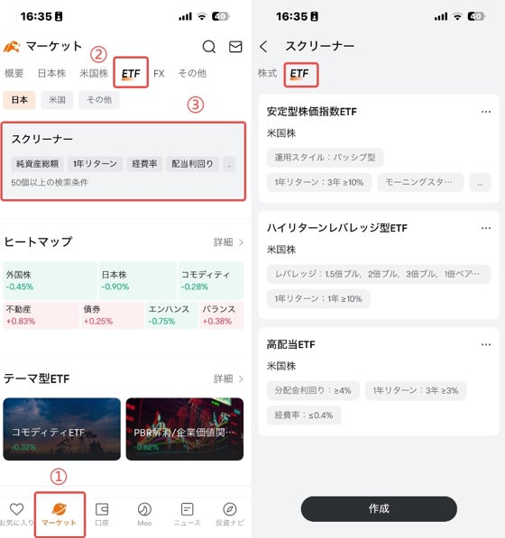 ETFスクリーナーは、(1) スマートフォンアプリ上、または(2) PC上でご利用になることが可能です。