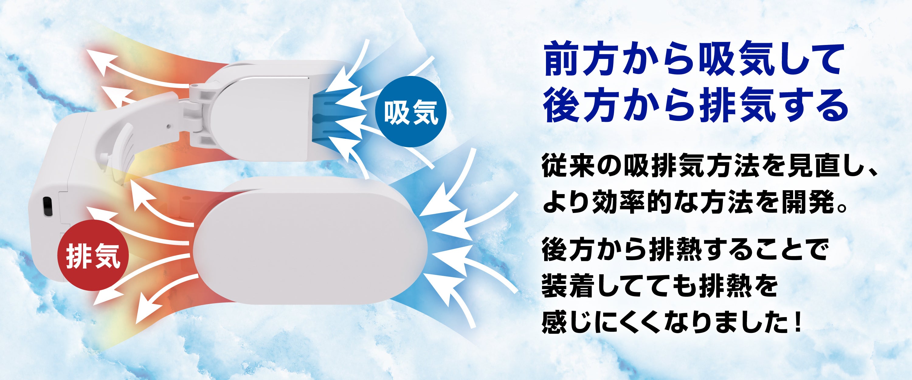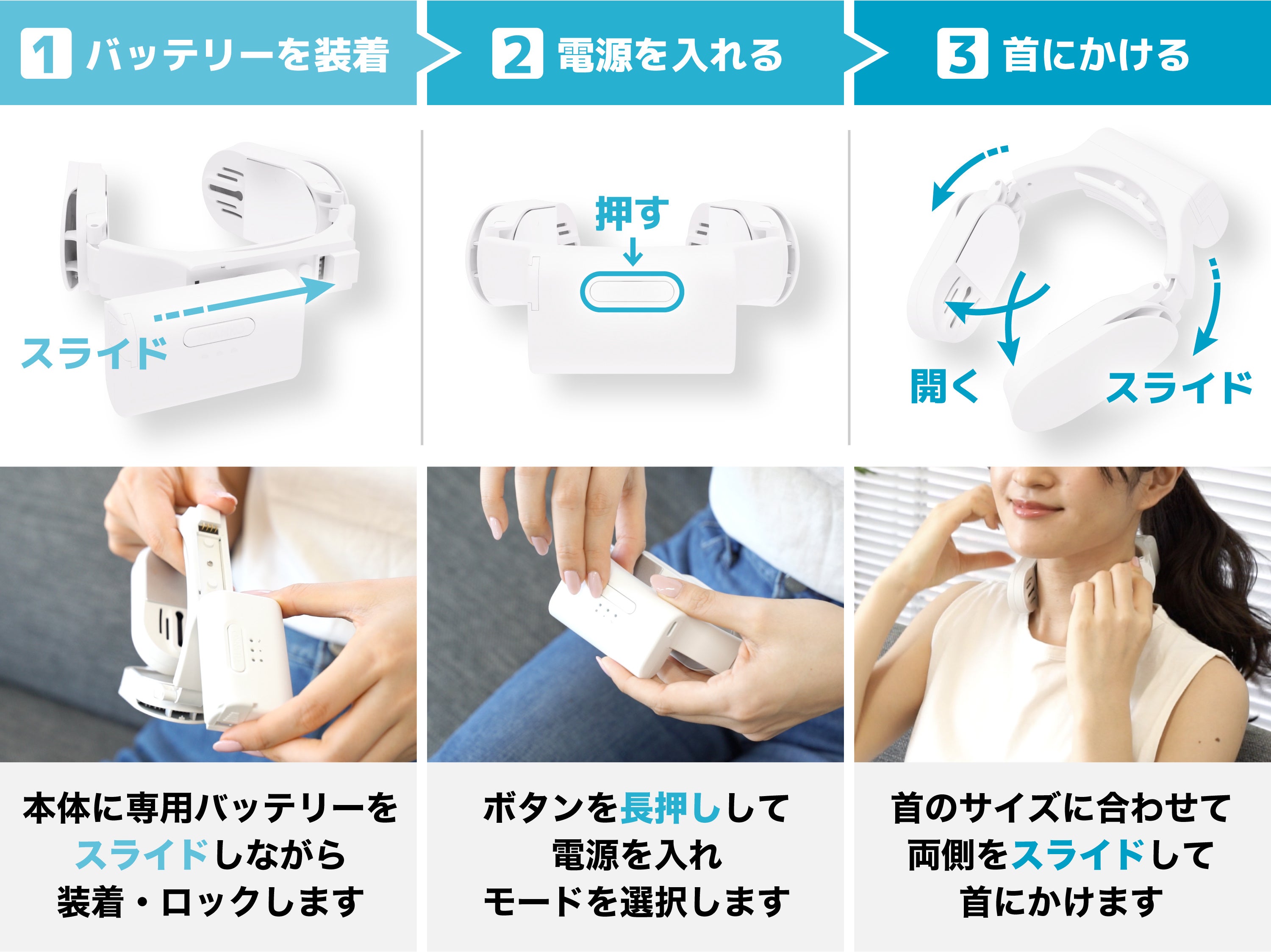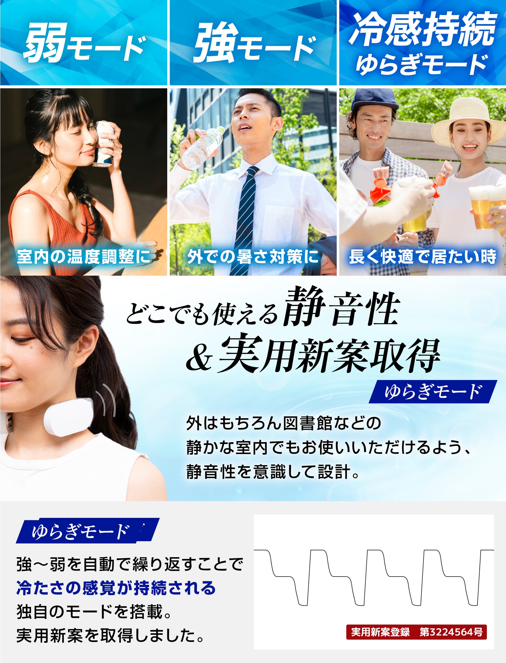 本体を首にセットし電源を入れるとプレート部分が約2秒で冷え、冷えたプレートが首にあたることでひんやりと涼しくなることが出来ます。冷却システムは小型の冷蔵庫と同じペルチェ冷却方式を採用。電気を流すと冷却する仕組みの為、長時間使用時でも冷却効率が落ちずに使えます。強、弱、ゆらぎモードの3段階切り替えが可能で、プレート温度は外気温よりそれぞれ強モード時約-17度、弱モード時約-8.5度。ゆらぎモードは強と弱を自動で繰り返し、冷感を持続させます。(実用新案登録第3224564号)