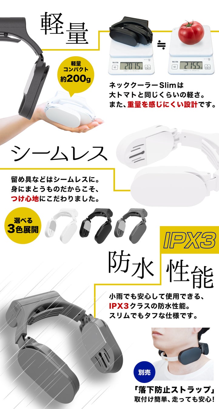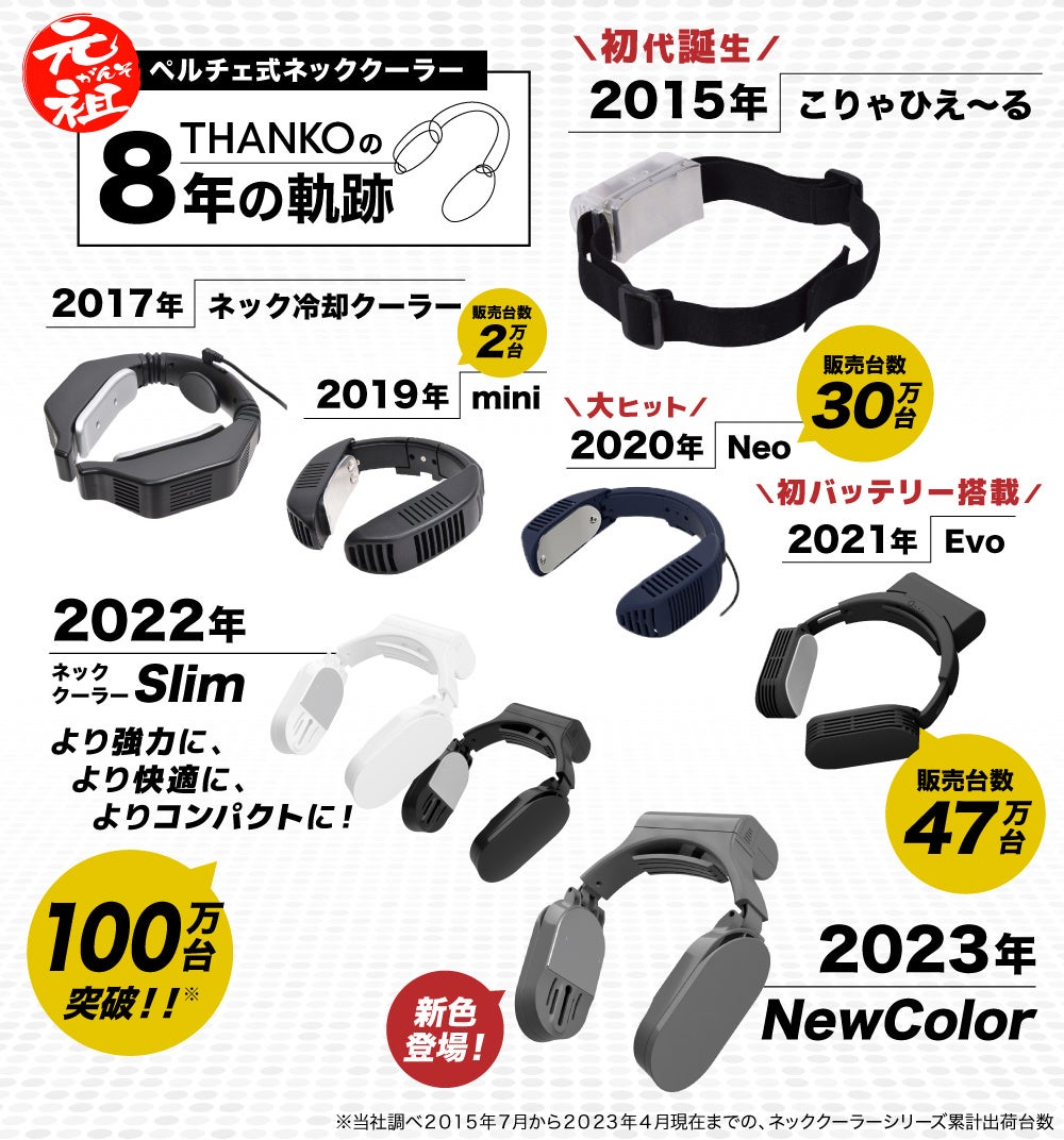 本製品は首に巻きつけて使うウェアラブル型のクーラーです。2015年にサンコーが生み出したネッククーラーシリーズは累計100万台を突破、2022年4月にネッククーラーSlim「ホワイト」「ブラック」を発売。2023年の新カラーとして「グレー」を発売いたしました。