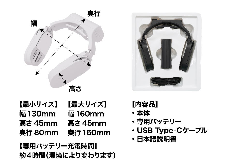 サイズ可変式で女性でも男性でもぴったりとフィットして使えます。重さは約220gで長時間付けていても快適。前作よりもバッテリーを薄く改良、重心をより体に近づけたことにより、重さを感じづらくフィット感を向上させました。使わない時はコンパクトにすることができるので、ポケットや、カバンなどに入れることが可能です。生活防水(IP33※)で雨の中でも安心してお使いいただけます。