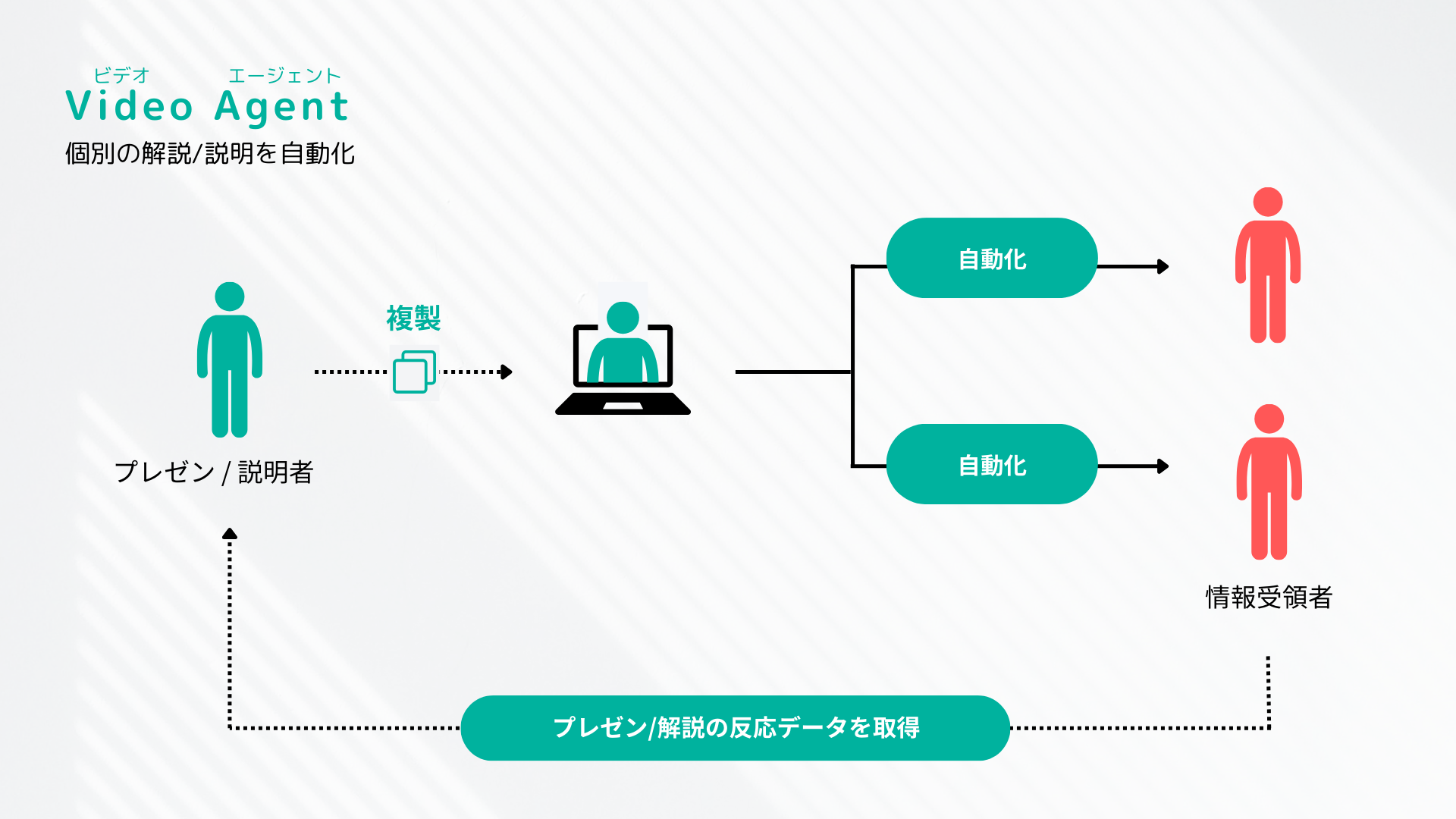 Video Agentは、AIを活用して“人が話す”ようなプレゼンテーションや解説を自動で行うソリューションです。営業資料の説明、カスタマーサポート、PR、IR活動、社員教育、オンボーディング、さらには採用活動まで、幅広い分野で活用可能です。これからの企業活動において、「伝える」ことをもっとスマートに、もっと効果的に。Video Agentがその未来を支えます。