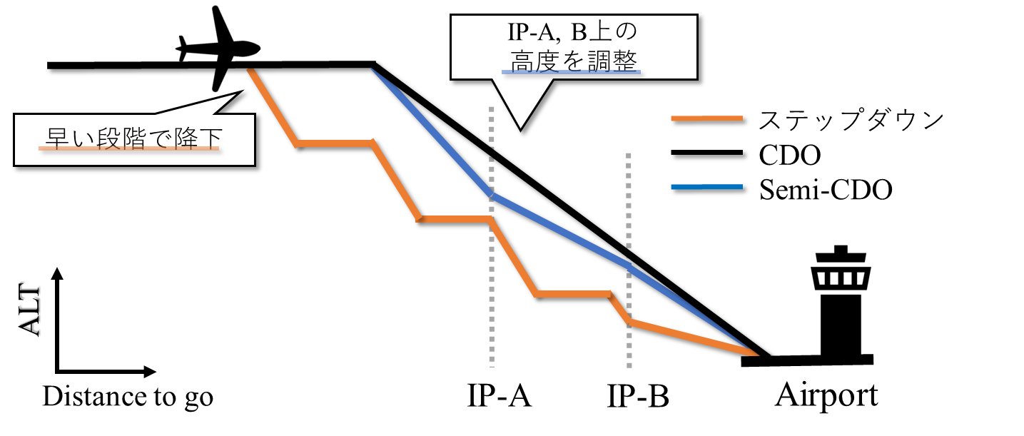 本研究では、従来の継続降下運航(CDO)において、降下途中での高度調整を行うことで間接的に到着時間を制御できることを見出しました。そして、CDOに数理モデルベースでの高度調整アルゴリズムを取り入れた交通管理手法であるSemi-CDOを開発しました。