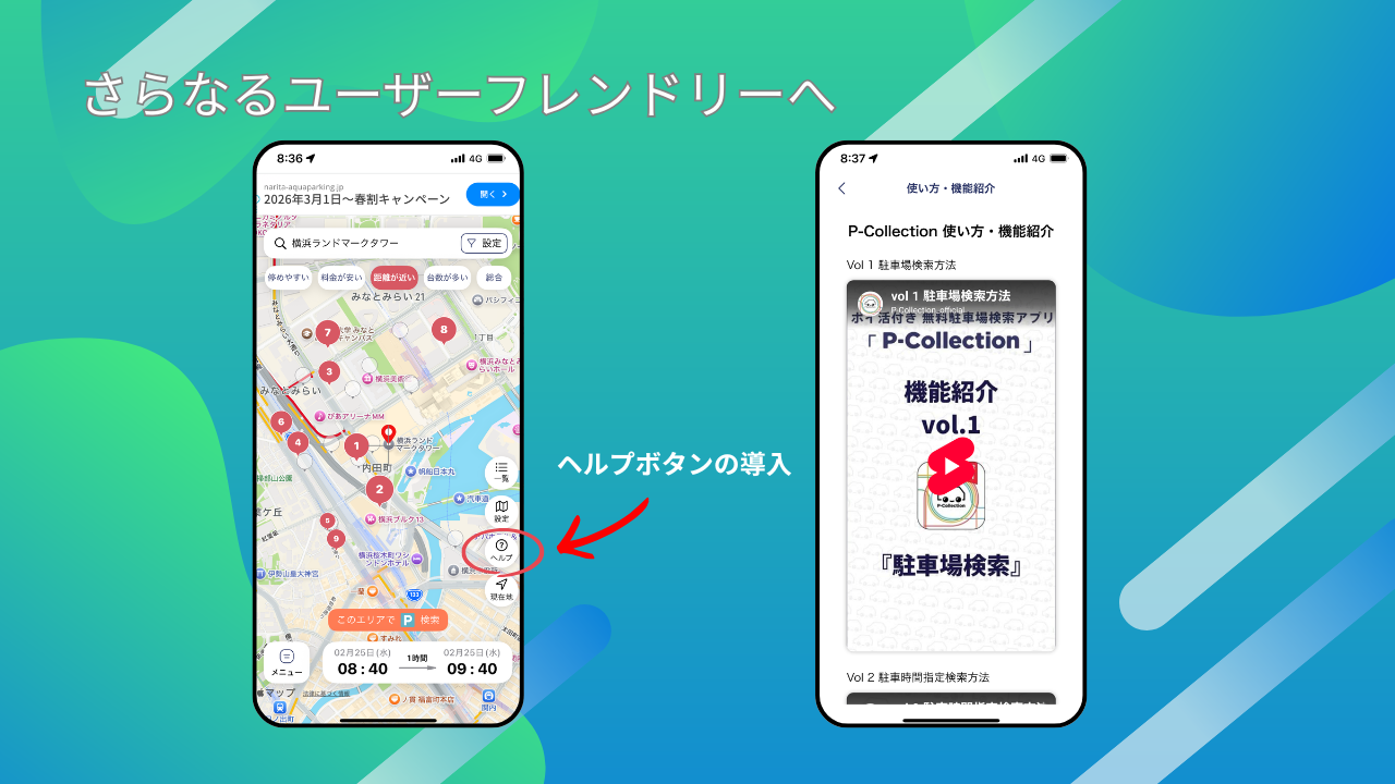 【無料】駐車場検索アプリP-Collectionは、2月9日に最新アップデート版であるver.3.5.1をリリースいたしました。ver3.5.1は「さらなるユーザーフレンドリーへ」を目指し、ヘルプ機能を導入いたしました。駐車場検索方法はもちろん、お気に入り登録方法などの各種機能、そしてポイントを貯める方法まで動画で解説を確認することができるようにアップデートされました。