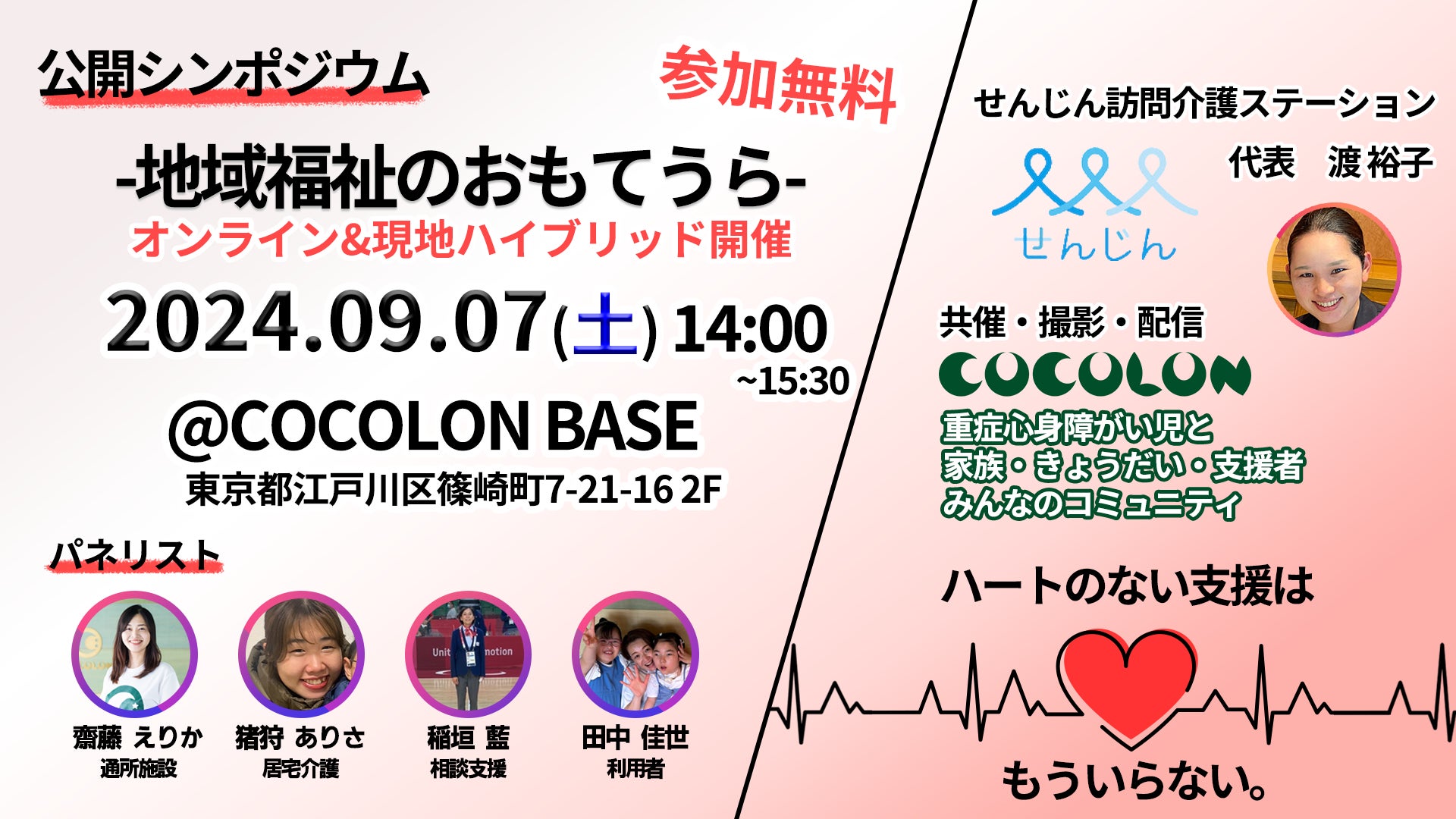 重症心身障がい児のと家族や支援者向けに学び・遊び・情報を提供をする「COCOLON」(運営:特定非営利活動法人EPO、東京都江戸川区、代表:齋藤えりか)は、せんじん訪問介護ステーション(東京都中央区、代表:渡裕子)が主催するシンポジウムを共催することが決まりましたのでお知らせします。本シンポジウムは地域福祉の現状とこれからについて様々な職域の登壇者が議論します。COCOLON BASEでの現地参加とオンライン参加が可能で、どちらも参加費は無料です。ぜひご参加をお待ちしております!