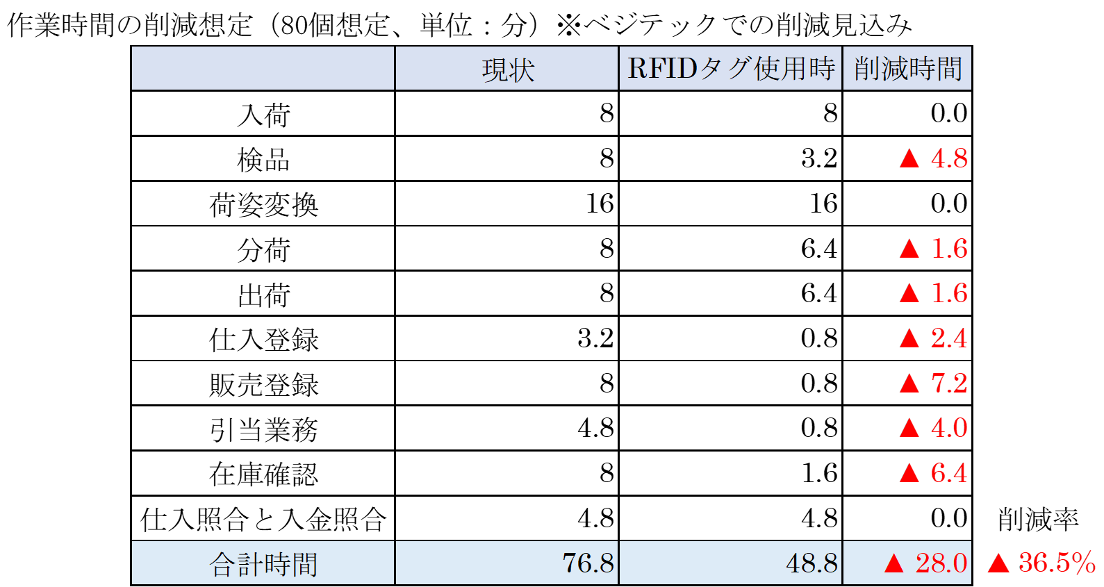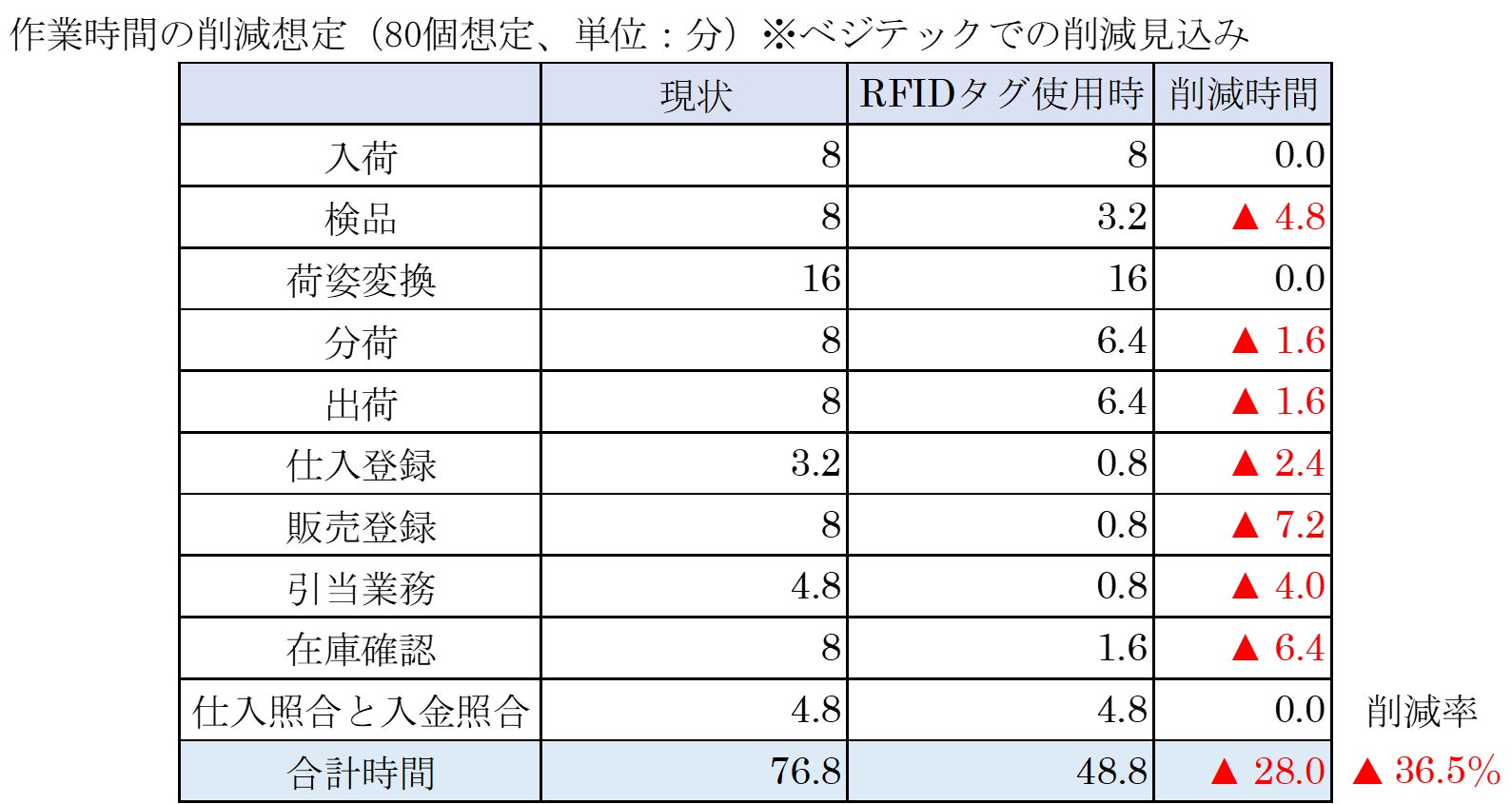 これらデータ連携により入出荷などのデータ活用が可能となり、これまで各集出荷拠点において手作業で行っていた検品作業もRFIDハンディリーダーによる情報読み取りといった検品処理の効率化が見込まれています。最終的には、作業時間削減による30%以上の経費削減を目標に取り組んでいきます。また、トレーサビリティが確保されることにより、万が一の商品回収時の回収作業(事故品の特定と出荷停止、回収)にかかる時間も30%以上削減を目標とします。