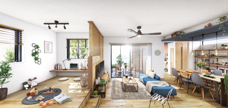 爽やかな陽光が注ぎ、木の温もりが漂うリビングダイニング。空を見渡すことのできるグランピングバルコニーなど、木と空と心豊かにふれあえる空間です。