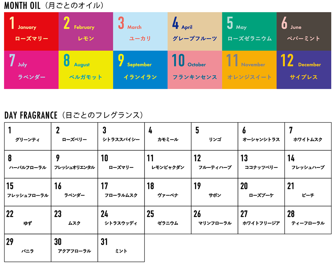 【月ごとのオイル12種】×【日ごとの香り31種】で作られた366種類の異なる香りのフレグランス。