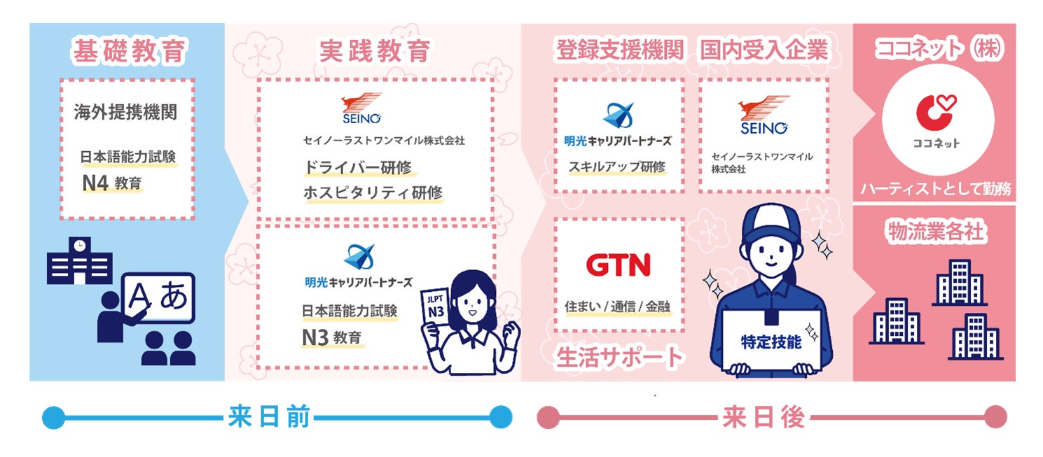 本プログラムは、2024年12月に特定技能制度に追加された「自動車運送業」に対応し、現地教育機関にて運転技術・安全基準・ホスピタリティを一貫して教育。修了者は、セイノーラストワンマイルのグループ会社にて『ハーティスト』※3として採用される予定です。