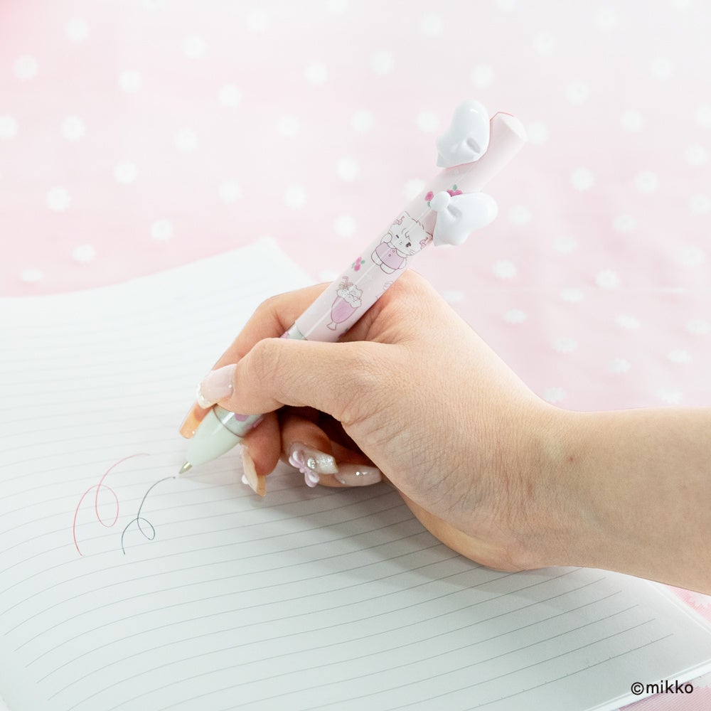 大きなリボンが特徴的な赤と黒の2色ボールペン。