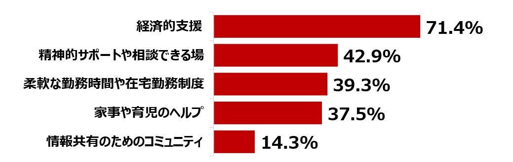 一方、仕事と子育ての両立がしやすくなると感じる支援については、「経済的な支援」が71.4%で最も多い中、「精神的サポートや相談できる場」が42.9%となり、シングルマザーが一人でさまざまな苦労や課題を抱え込まないような社会の仕組みが求められていることも明らかになりました。誰かからの支援で嬉しかったことの自由回答は、「母親の助けが、正直助かった」「友人が子供を少し見ていてくれて2時間程眠れた」「頑張ってと応援してくれること」など、本当に些細なことでも周りの気遣いや手助けが大きな支えになっています。