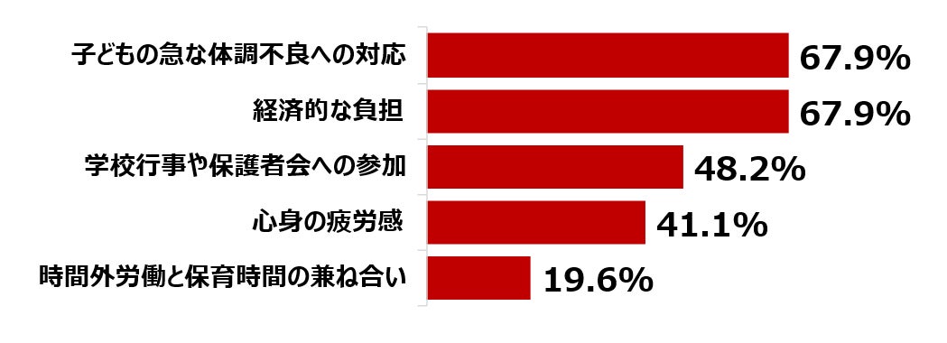 ●仕事と子育て両立の苦労は、「子どもの急な体調不良への対応」と「経済的な負担」が同率トップ
