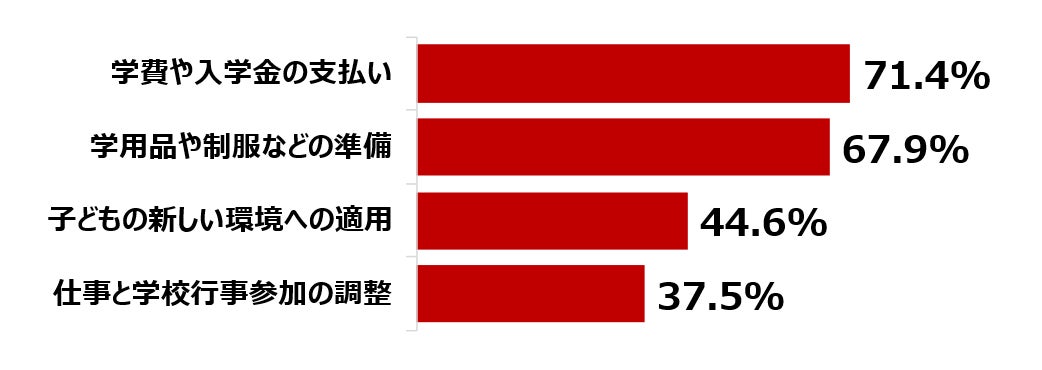 ●子どもの入学・進学時に最も大変だと感じることでは、「学費や入学金の支払い」が71.4%