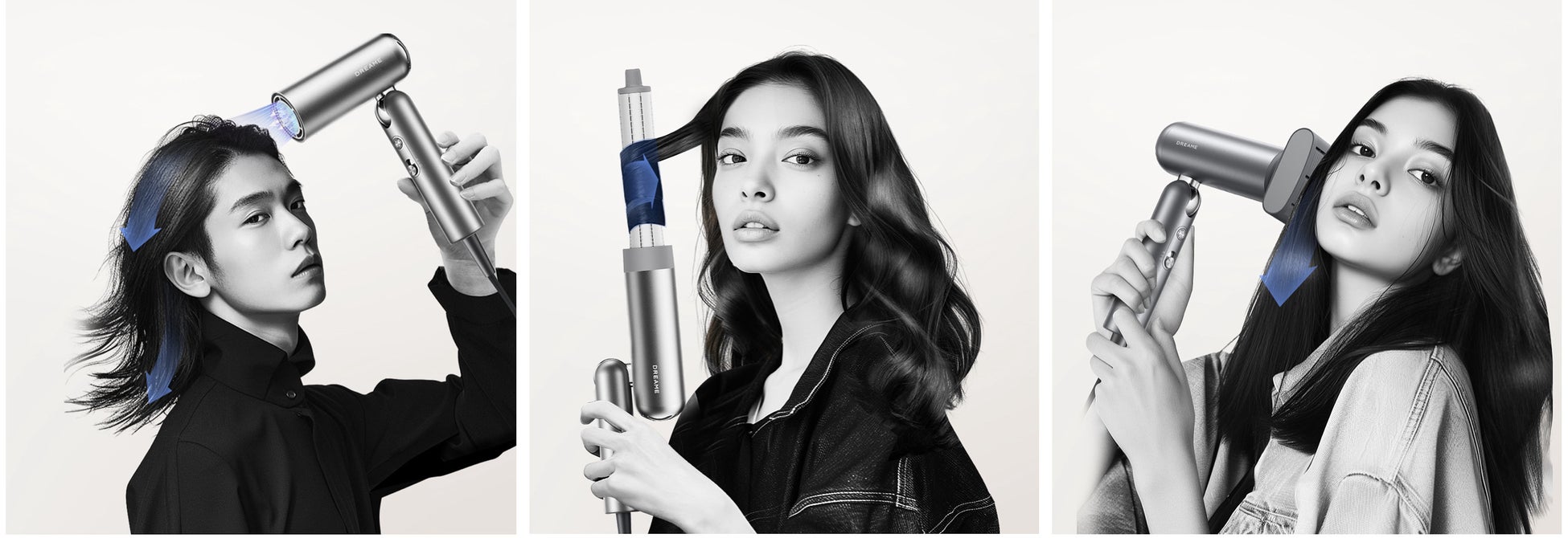 Dreame Pocketは一台で多くの機能を備えています。吹き出し口の角度調整や、様々な磁気アタッチメントと組み合わせて 個々のスタイルに応じたカスタマイズした使い方が可能です。折りたたんだ状態では手提げバッグに収納でき、90度の状態ではストレートコームノズルを使用してストレートに仕上げ、まっすぐに伸ばした状態ではカーリングロッドノズルを使って美しいカールを作り出します。多様なスタイルに対応し、様々なシーンに応じた柔軟性が魅力です。