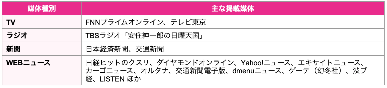 メディア掲載:20社以上(TV・ラジオ・WEBニュース・新聞)