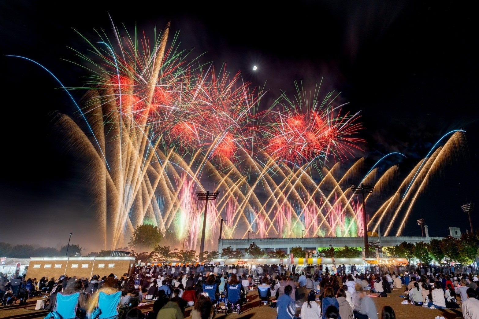 第一回よねざわ戦国花火大会(URL:https://sengokuhanabi.com)は、山形県米沢市の歴史である「戦国」をテーマに、8000発の花火、ドローンショー、やまがた愛の武将隊による新作演舞を組み合わせた、新たな花火エンターテイメントとして、10月12日(土)に開催されました。メイン会場に隣接した米沢市・総合運動公園で行われた多数の同時開催イベントには13時の開場から来場者が途切れることなく訪れ、会場周辺は花火大会終演まで多くの来場者で賑わいました。