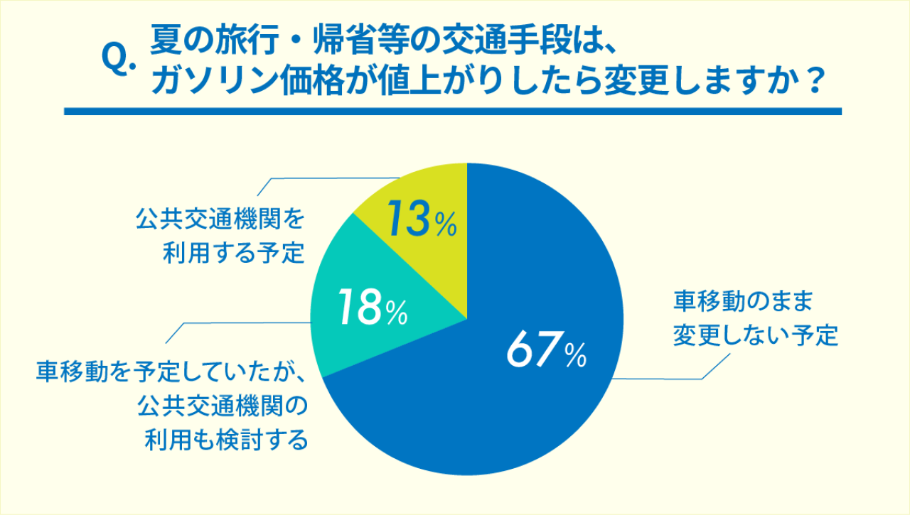 ・「ガソリン価格が値上がりしたら、交通手段は変更しますか?」の質問に対して、公共交通機関を利用する予定の方が13%なのに対し、車移動のまま変更しない予定の方が 67% と一番多い結果となりました。