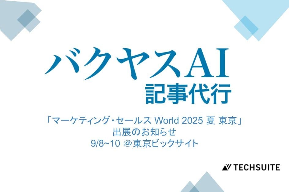 TechSuite株式会社(テックスイート/代表取締役: 畠山夏輝)は、2025年9月8日(月)から10日(水)の3日間で東京ビックサイトで開催される「マーケティング・セールス World 2025 夏 東京」に出展し、生成AIを活用した最先端のコンテンツSEOサービス「バクヤスAI 記事代行」をご紹介いたします。